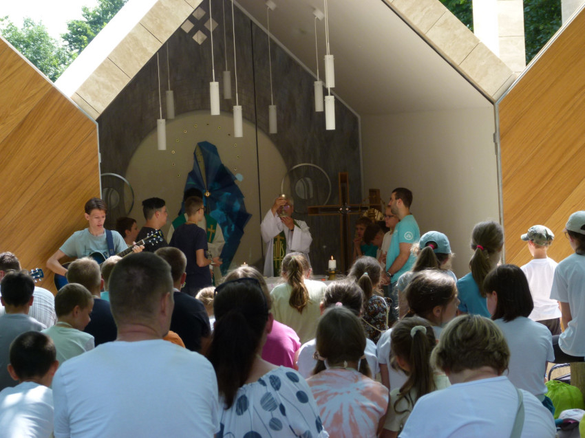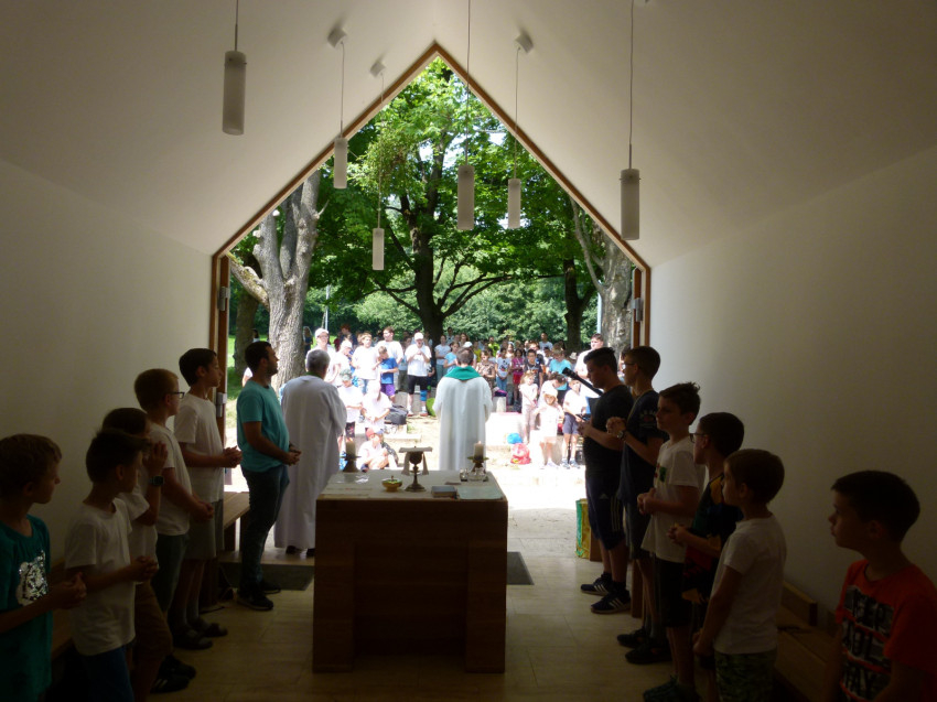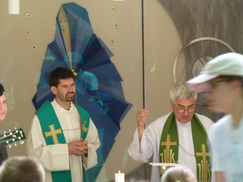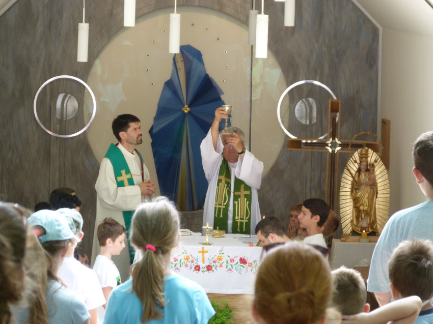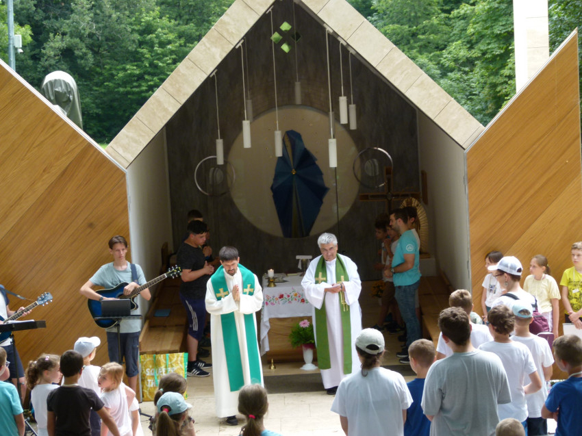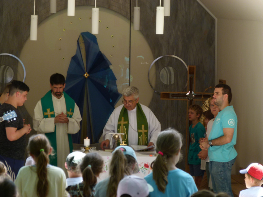 A gyerekek közül sokan gyóntak, a gitárosok, ministránsok, olvasók pedig buzgón készültek, hogy méltó, szép szentmise legyen. Mise előtt elimádkoztunk egy rózsafüzér-tizedet, amit a békéért ajánlottunk fel. A két Horváth atya, Zoltán atya a főplébániáról és István atya a kertvárosiból együtt mutatták be a szentmisét, amely szintén a békéért ajánlottunk fel. Felejthetetlen élmény volt, ahogy zengett a kápolna körüli erdő az allelujától.