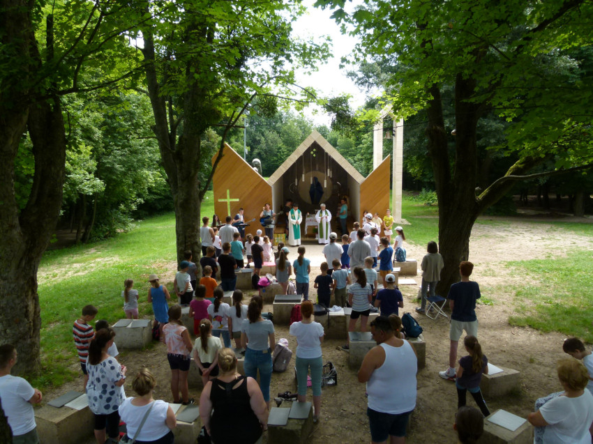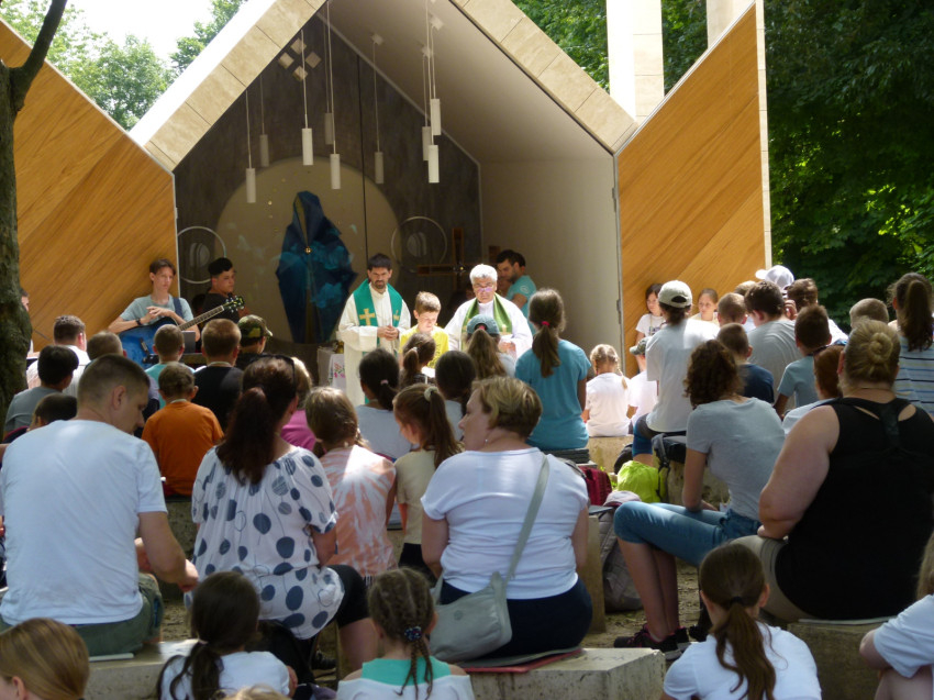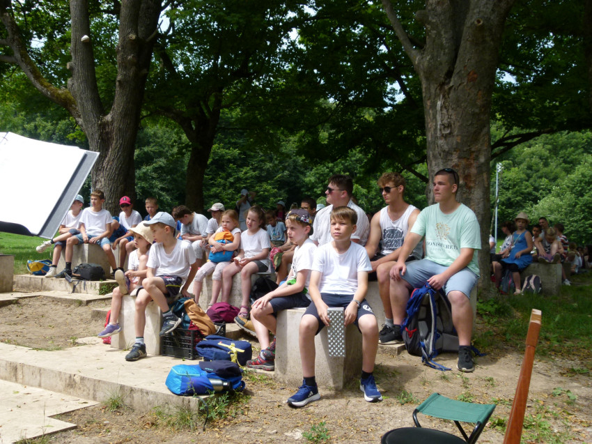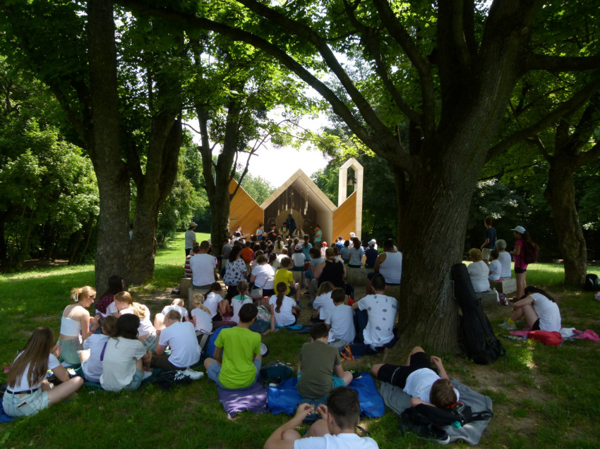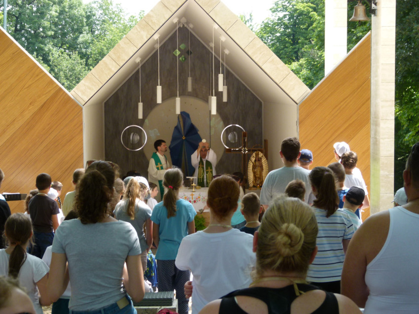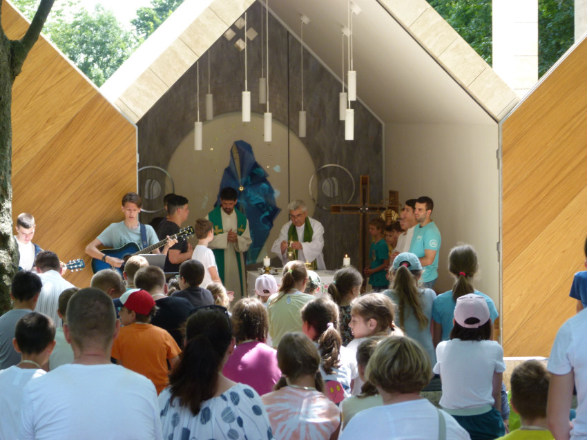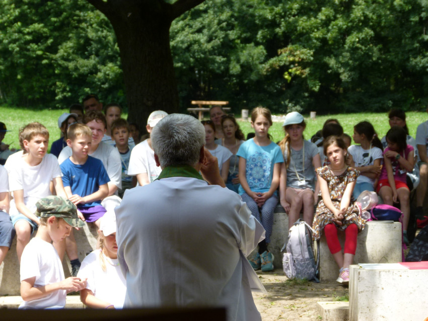 A gyerekek közül sokan gyóntak, a gitárosok, ministránsok, olvasók pedig buzgón készültek, hogy méltó, szép szentmise legyen. Mise előtt elimádkoztunk egy rózsafüzér-tizedet, amit a békéért ajánlottunk fel. A két Horváth atya, Zoltán atya a főplébániáról és István atya a kertvárosiból együtt mutatták be a szentmisét, amely szintén a békéért ajánlottunk fel. Felejthetetlen élmény volt, ahogy zengett a kápolna körüli erdő az allelujától.