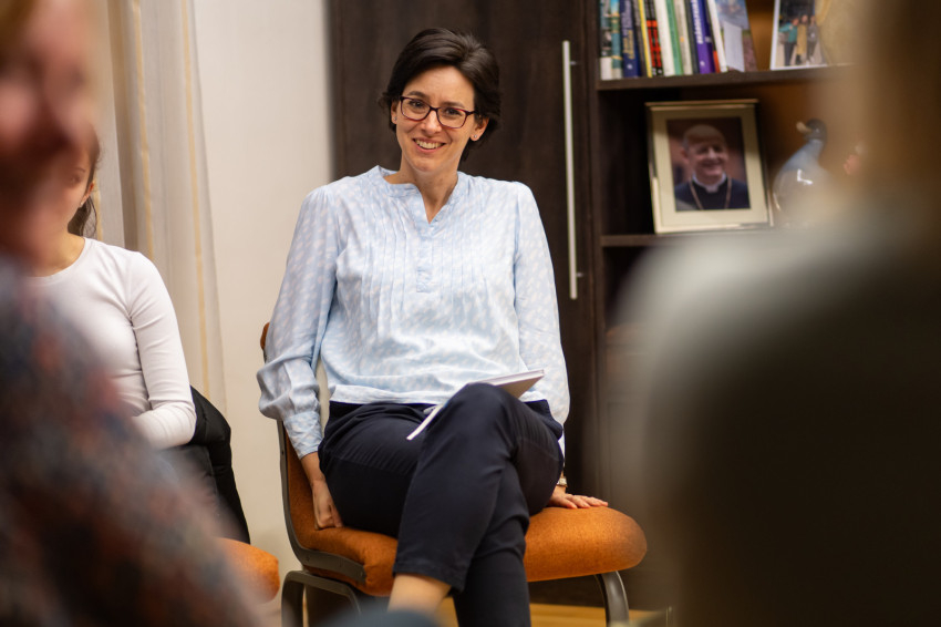 A Kökörcsin utcai épületben egy nagyobb csapat fogad minket, vannak köztük Opus Dei-tagok, jelenlegi és visszajáró kollégisták. Az Opus Deire jellemző igényességgel berendezett, családias nappaliban beszélgetünk. Közvetlen, vidám a hangulat, a fiatalok a beszélgetésben megnyílnak, szavaikból sugárzik, hogy szeretik ezt a helyet, a végén pedig már ismerősként kísérnek végig bennünket az épületen, hogy megnézzünk egy-egy szobát, a kápolnát, az étkezőt, a teraszt, a teakonyhát.