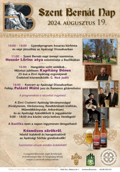 A Szent Bernát-napon a Zirci Ciszterci Apátság látványosságai (Királyterem, Vöröstorony, rendtörténeti kiállítás, műemlék könyvtár, arborétum) és az apátsági ajándékbolt 9 és 18 óra között várja a vendégeket. A bazilika ezen a napon ingyenesen látogatható.