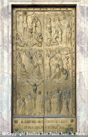 A kapu alján latin felirat olvasható: Ad sacram Pauli cunctis venientibus aedem – sit pacis donum perpetuoque salus. (Mindazoknak, akik Szent Pál szentélyébe jönnek, adassék a béke és az örök üdvösség ajándéka.)