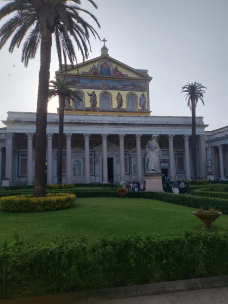 Másnap ragyogó napsütésben zarándokoltak a Falakon kívüli Szent Pál-bazilikába, melynek előterében, az egyiptomi gránitoszlopsor árnyékában, Szent Pál hatalmas szobra előtt készültek a belépésre.