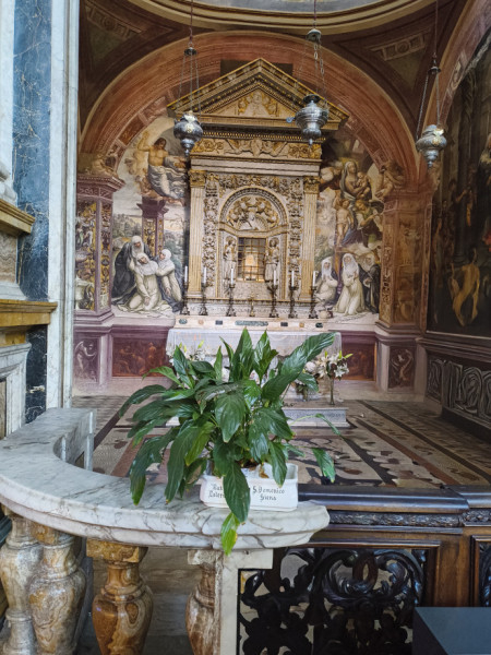 A carrarai márványból készült oltárt több nagy művész, köztük Michelangelo alkotásai díszítik.