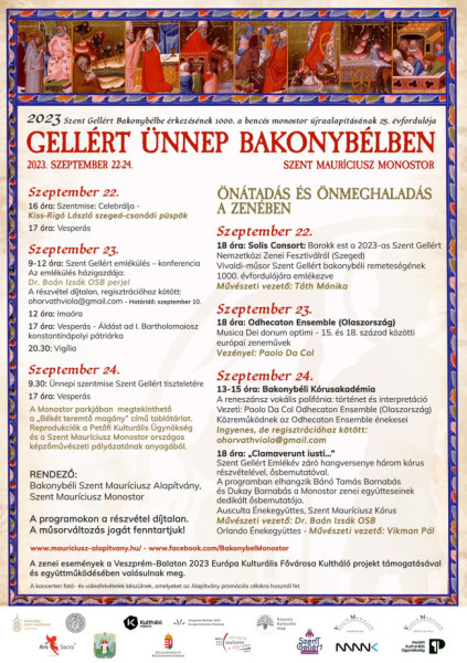 Szeptember 23-án 9–12 óra között kerül sor a Szent Gellért Emlékülésre, melynek házigazdája Baán Izsák OSB perjel lesz. Ezen szó esik a magyar katolikus jelenlétről a világban, a témát Érszegi Márkkal, a Külgazdasági és Külügyminisztérium vallásdiplomáciai főtanácsadójával járhatjuk körül, de az érdeklődők Szent Gellért-kultusz Velencében címmel hallhatják majd Szabó Katalin, a Trivenetói Olasz-Magyar Kulturális Társaság elnökének előadását is. A bencés szerzetesi megújulás lehetséges útjairól Patrice Mahieu, a franciaországi solesmes-i bencés monostor szerzetese elmélkedik majd. Terítékre kerül a bencés pedagógia is a Pannonhalmi Bencés Gimnázium igazgatója, Juhász-Laczik Albin gondolatai nyomán. Gabriele La Posta, a Budapesti Olasz Kultúrintézet igazgatója révén szó esik majd az itáliai–magyar művészeti kapcsolatokról is. Végül Baán Izsák számol be arról, hogyan válhat Bakonybél zenével és imádsággal teli völggyé a Bakony szívében.