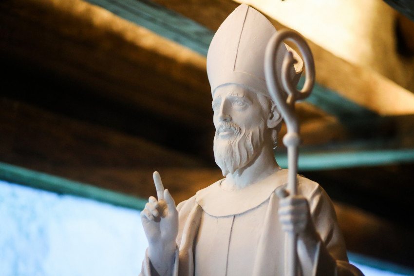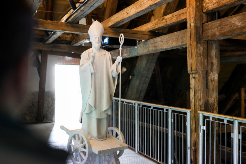 A Szent Gellértet ábrázoló egész alakos gipszszobrot a fedélszéken, a két torony közötti zárt átjárón helyezték el. Megalkotására Osztie Zoltán még a koronavírus-járvány kitörése előtt, 2019 decemberében kérte fel Tóth Dávidot.