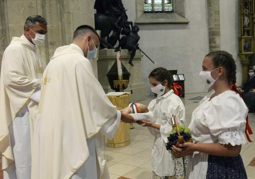 A népviseletbe öltözött fiatalok és a cserkészek az oltár elé hozták az áldozati adományokat és a kenyérrel teli kosarakat, ugyanis e szentmise keretében az új kenyér megáldására is sor került, szívből hálát adva a mindennapi kenyérért.