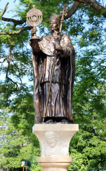 A szobor – Oláh Katalin Kinga szobrászművész alkotása – a hagyományos ábrázolásmódok azon típusát követi, amelyek esetében Szent Norbert püspök álló figurája attribútumokkal látható.