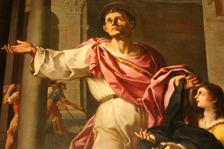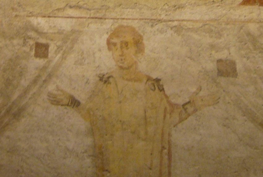 Pammachiust ábrázoló freskó (lent) a római Szent János és Pál vértanúk-bazilikában