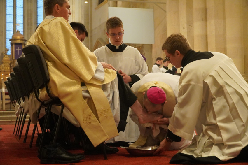 Román, magyar és német nyelven elmondott homíliájában Johann Dirschl általános helynök felidézte az Eucharisztia megalapítását, amit Jézus az apostolaira bízott a halála előtti utolsó közös vacsorán. „Szent János evangélista beszámol arról, hogy Jézus egy másik utat is megmutatott: a szeretet útját. Jézus ugyanis »levetette felsőruháját, fogott egy vászonkendőt, és maga elé kötötte. Aztán vizet öntött egy mosdótálba, majd hozzáfogott, hogy sorra megmossa, s a derekára kötött kendővel megtörölje tanítványainak a lábát.« Jézus korában ezt a munkát a szolgák végezték a házba érkező vendégekkel; egy rabbi vagy tanító aligha mosta meg a tanítványai lábát. A végén Jézus így szólt: »nektek is meg kell mosnotok egymás lábát«. A Megváltó ezzel olyan szeretetre hív, amely nem vár viszonzást.