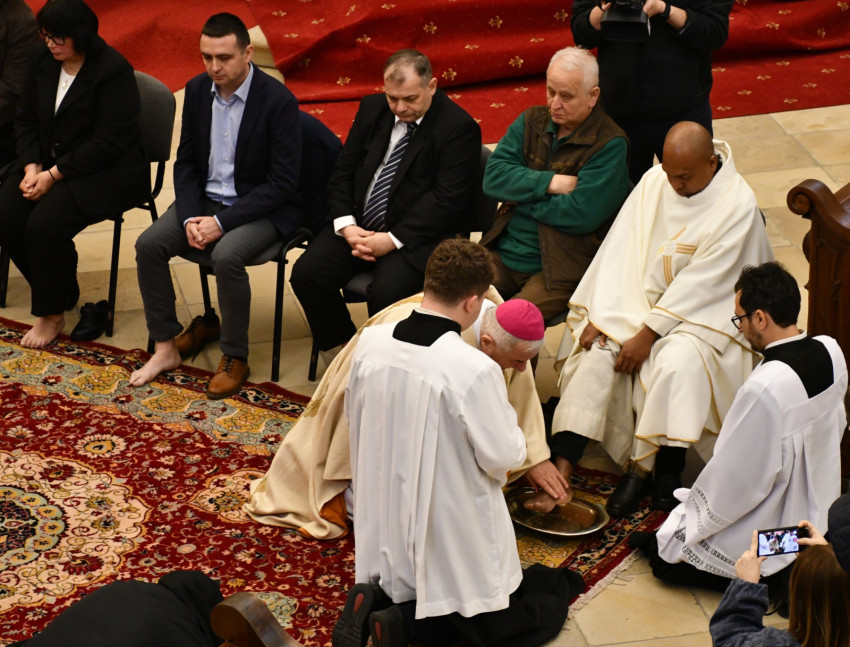 A prédikáció után a püspök a lábmosás szertartásában Jézus példáját követve megmosta a kiválasztott hívek lábát.