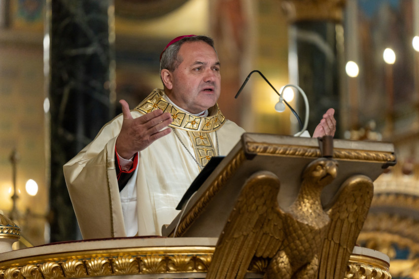 Felföldi László, a szentmise főcelebránsa köszöntötte a jubiláns énekkart, melynek tagjai között vannak, akik több mint húsz éve vesznek részt a liturgiák zenei szolgálatában. A főpásztor óriási kincsnek és ajándéknak nevezte szolgálatukat, és kifejezte köszönetét, amiért énekükkel gazdagítják a szentmiséket. Úgy fogalmazott, hogy a liturgia is, akár csak a benne felhangzó énekek, egy „dallamegységet” alkot, melyben meg kell találni Isten nekünk szóló tervét, hogy általa a szívünkben megszülessen egy megerősítő, küldetést adó üzenet.