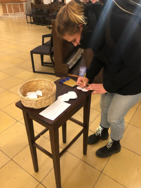 A Gyertyaszentelő Boldogasszony-templomban – hétköznapi nevén a pécsi dzsámiban – celebrált szentmise kezdete előtt a párok szív alakú papírra írták fel kéréseiket és fogalmazták meg köszönetüket.