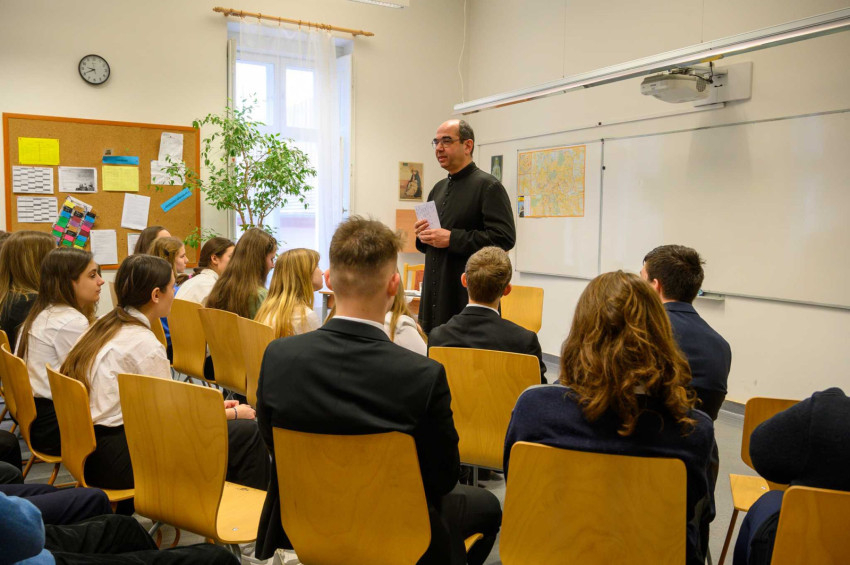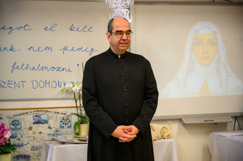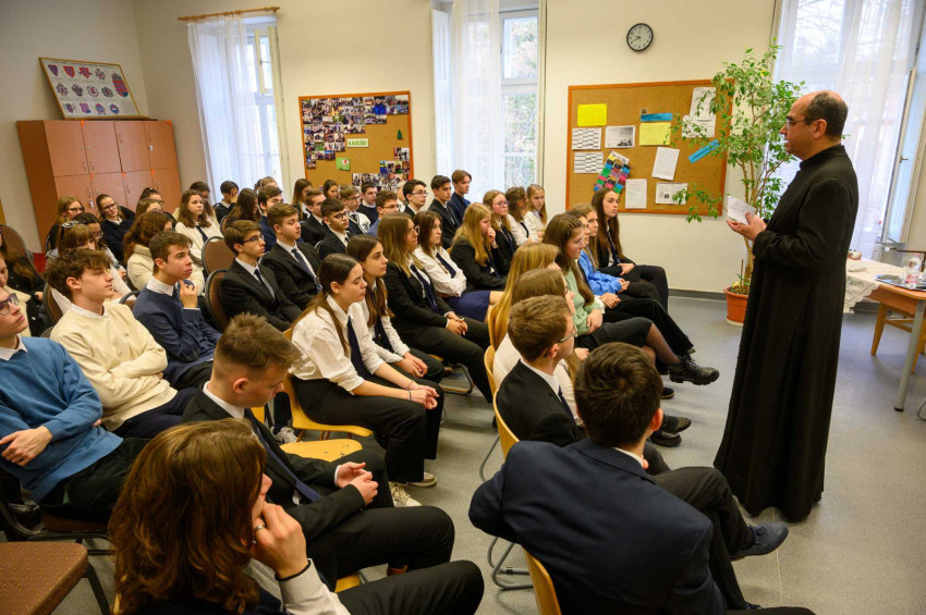 Míg a verseny zajlott, Székely János megyéspüspök a gimnázium diákjaival beszélgetett, válaszolt az általuk feltett – például az ördögűzéssel, gyógyítással, családon belüli erőszakkal kapcsolatos – kérdéseikre.