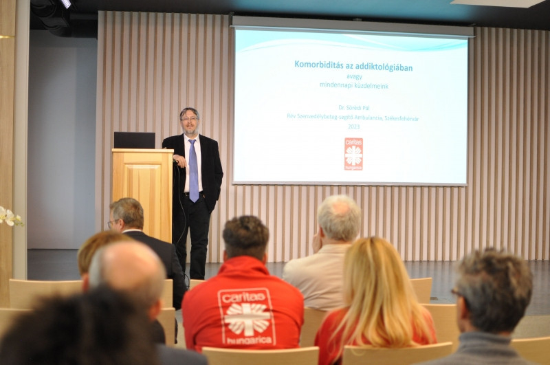 Komorbiditás az addiktológiában, avagy mindennapi küzdelmeink címmel Sőrédi Pál pszichiáter-addiktológus előadásával folytatódott a szakmai nap. A szakember munkatapasztalataiból és különböző felmérésekből kiindulva arról beszélt, hogy az esetek túlnyomó többségében a szenvedélybetegséghez pszichés zavar is társul, mint például depresszió, szorongás, pánikbetegség, személyiségzavar, és ez megnehezíti a betegek kezelését.