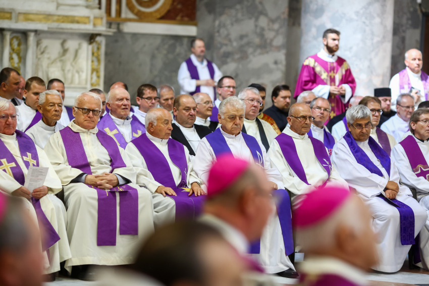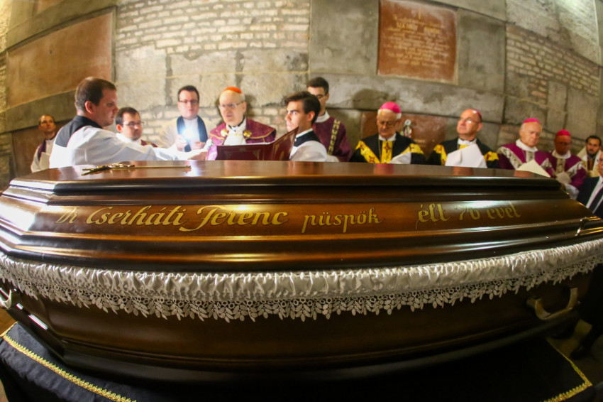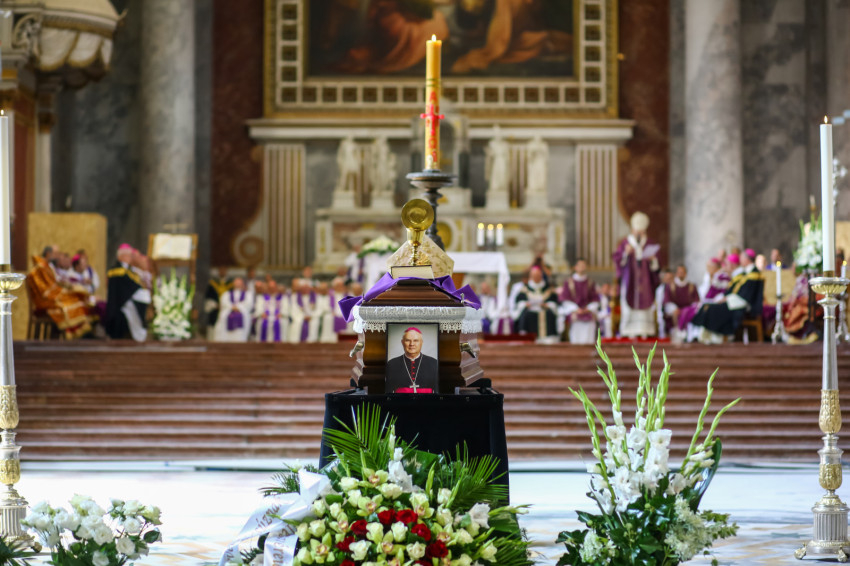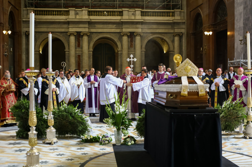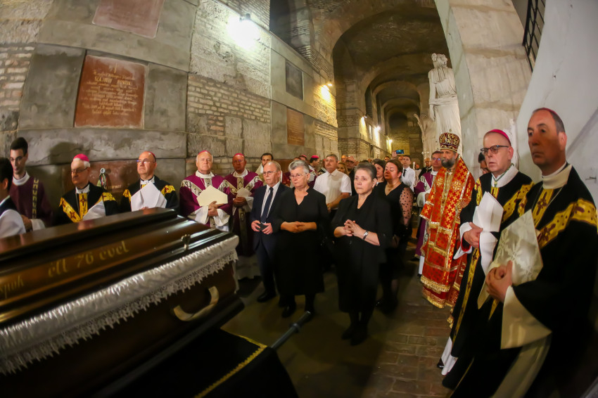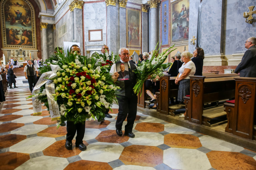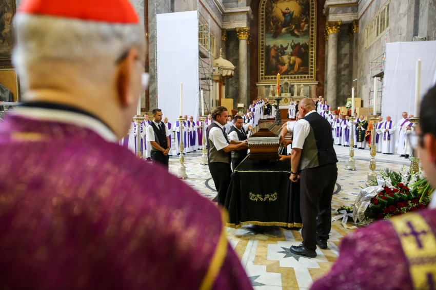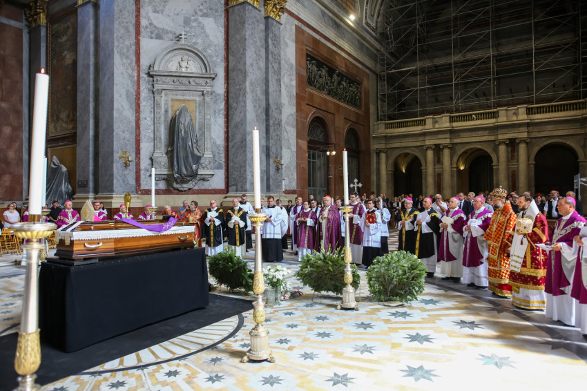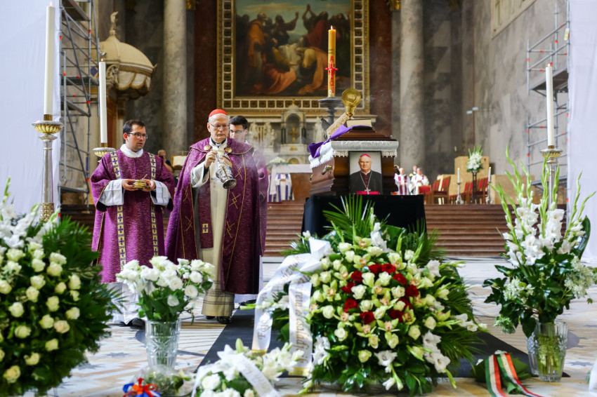 Búcsúvételre gyűltek össze papok, szerzetesek, hívek az esztergomi bazilikában. A tér közepén áll a ravatal, koszorúk veszik körbe a koporsót, rajta a püspöki és papi szolgálat jelvényei, középen az Eucharisztia kelyhe.