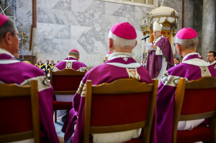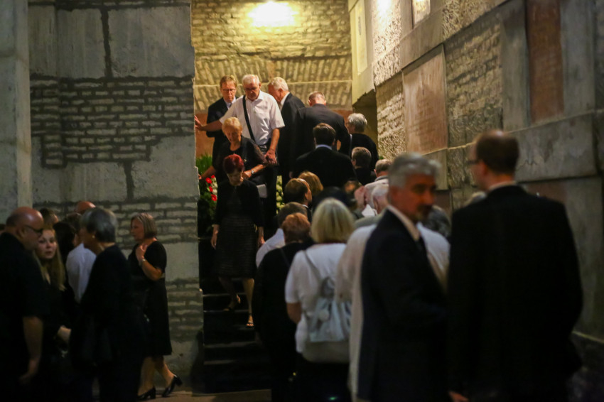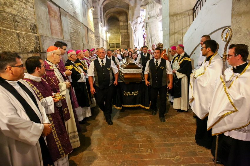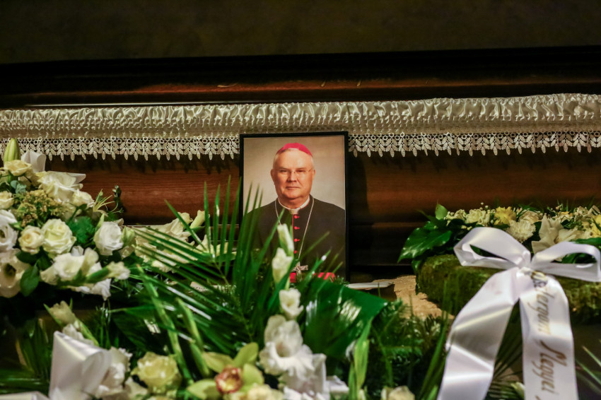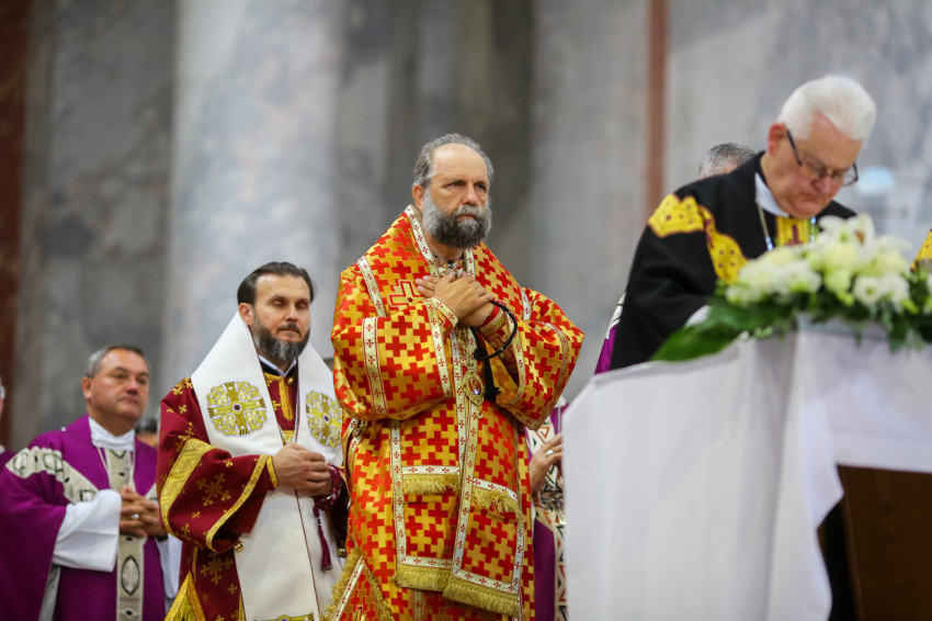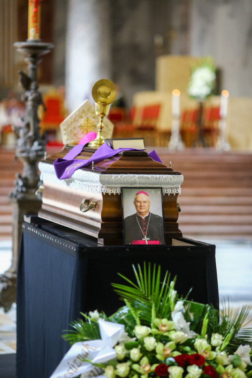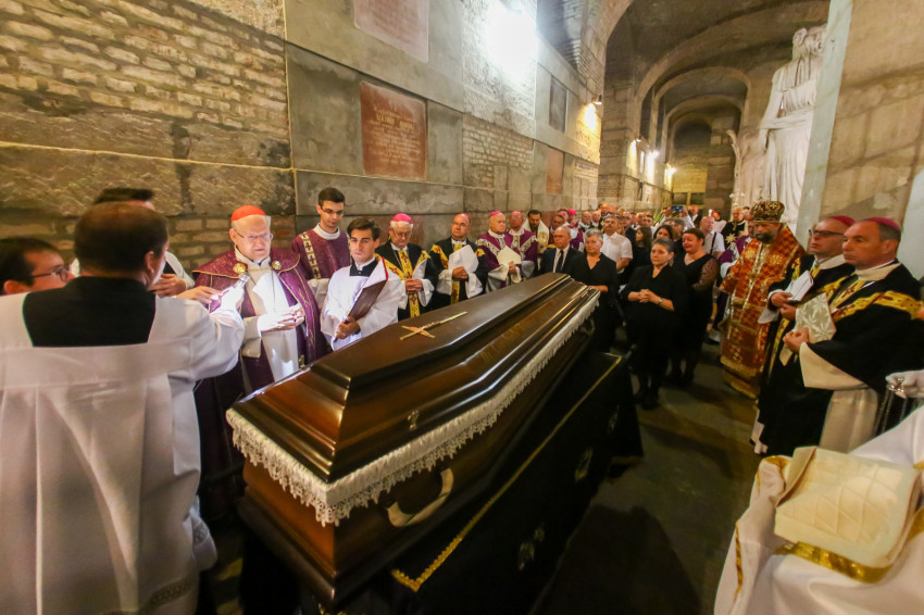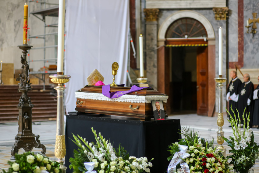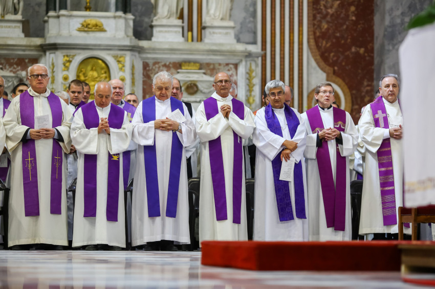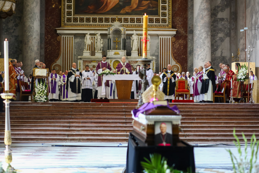 Búcsúvételre gyűltek össze papok, szerzetesek, hívek az esztergomi bazilikában. A tér közepén áll a ravatal, koszorúk veszik körbe a koporsót, rajta a püspöki és papi szolgálat jelvényei, középen az Eucharisztia kelyhe.