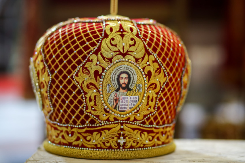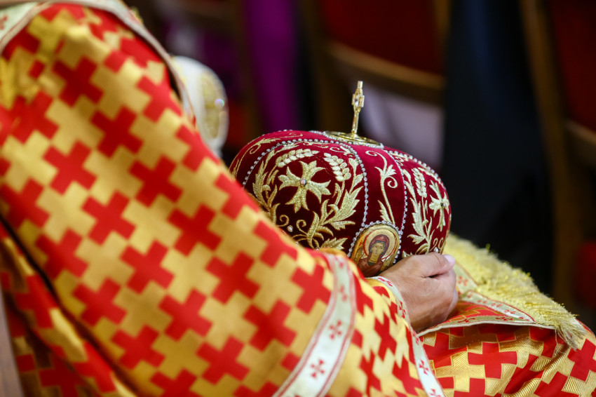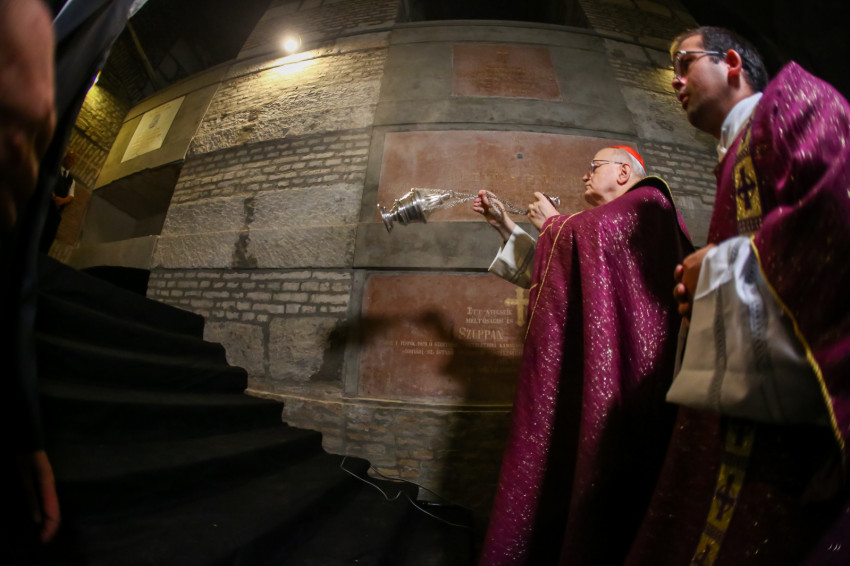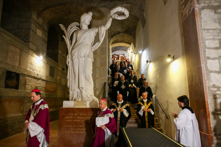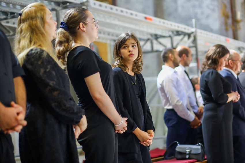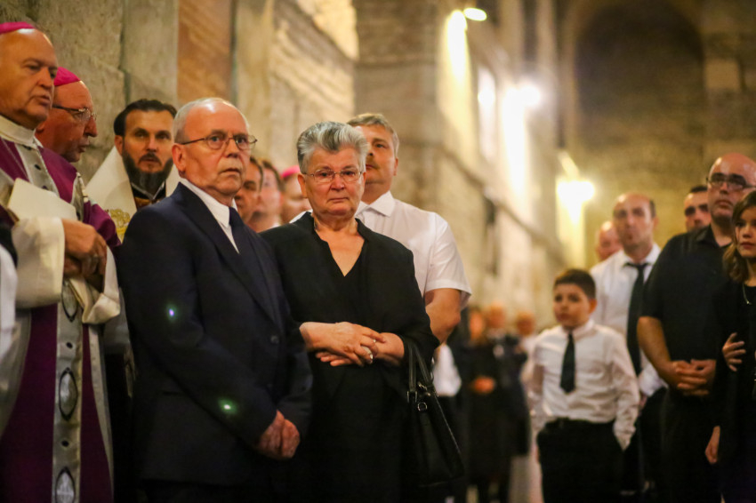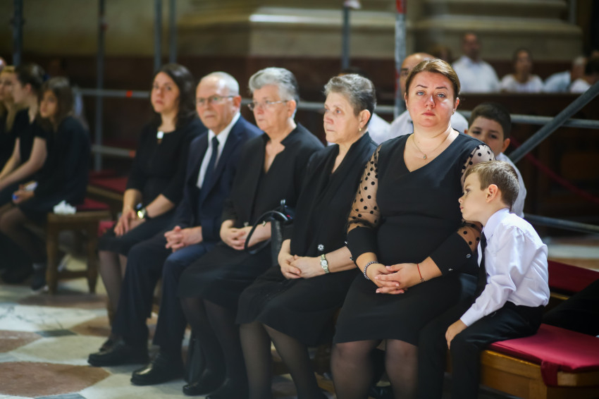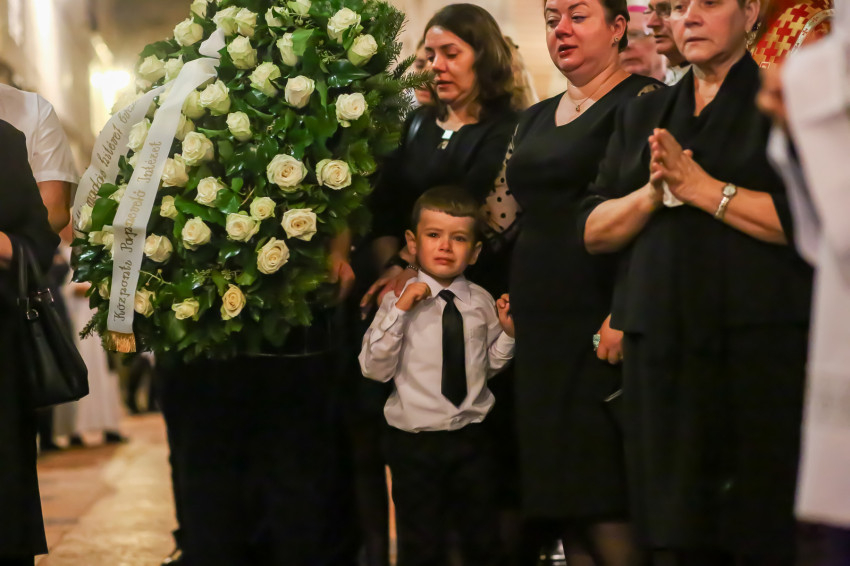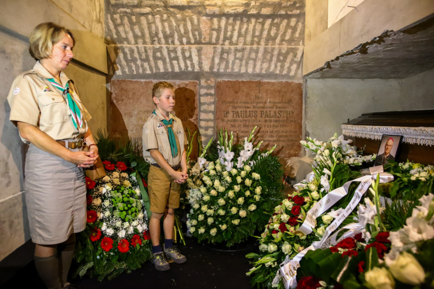 Búcsúvételre gyűltek össze papok, szerzetesek, hívek az esztergomi bazilikában. A tér közepén áll a ravatal, koszorúk veszik körbe a koporsót, rajta a püspöki és papi szolgálat jelvényei, középen az Eucharisztia kelyhe.
