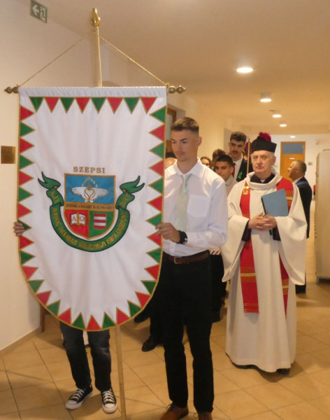 Az ünnepség liturgikus része a magyar címeres zászló megáldásával kezdődött. Az áldó ima után a megszentelt zászlóval az élen a ballagó diákok, a tantestület és a meghívott vendégek az iskolakápolnába vonultak, ahol megáldották a haranglábat és a harangot. Az új iskolaharangba Mécs László premontrei papköltő verssorait vésették: „Kongatom piros harangom, ifjú szívem kongatom.”