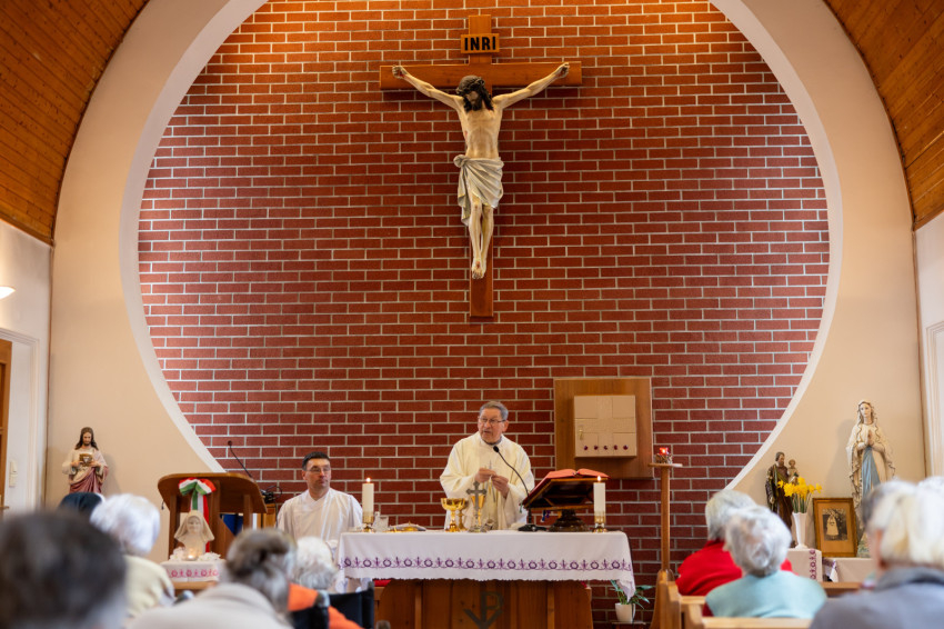 A kápolna felé megyünk tovább, ahol már zajlik a délelőtti szentmise. A padok tömöttek, úgy tűnik, mindenki itt van, aki csak tud. „Milyen jó, hogy Urunk, Jézus megtanította nekünk a Miatyánkot, ugye? Hogy a szívünkbe és az ajkunkra adta!” – kapunk el egy félmondatot a közvetlen hangú prédikációból. Zoltán atya kántor is, ő maga vezeti a liturgia énekes részeit.
