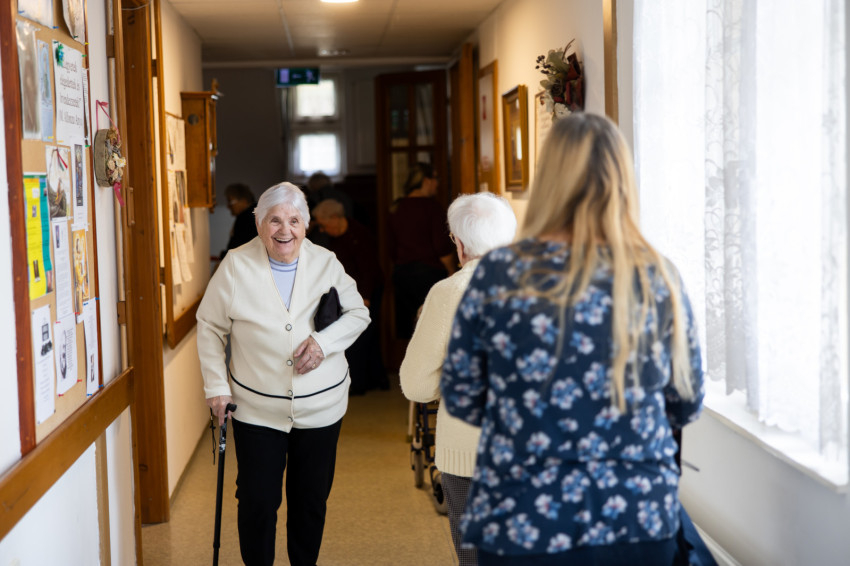 Körülöttünk zajlik az élet: egy család előgondozásra érkezett; jönnek-mennek a lakók, akik érdeklődve figyelnek, mindenki kedvesen biccent; a munkatársak közül is többen megállnak egy kávéra. Nem maradnak el a mosolyok. Otthonos érzés.
