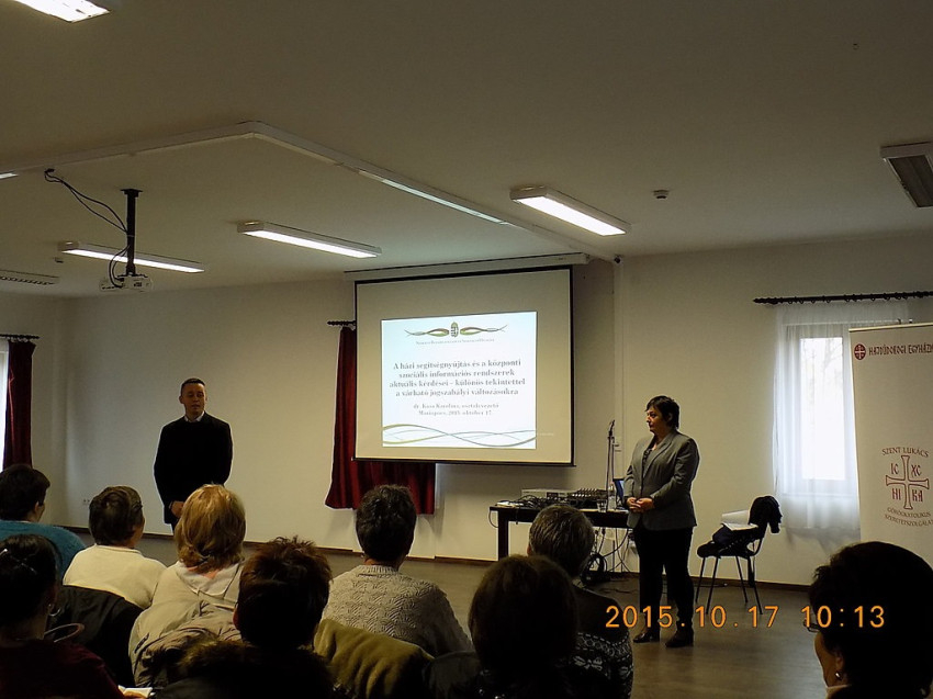 A házi segítségnyújtás aktuális kérdései, különös tekintettel a várható jogszabályi változásokra címmel az Emmánuel-ház nagytermében Kása Karolina, a Nemzeti Rehabilitációs és Szociális Hivatal osztályvezető előadását hallgathatták meg a szakmai vezetők. Az előadással párhuzamosan a jelen lévő gondozott, ellátott zarándokoknak Kapin István kegyhelyigazgató tartott elmélkedést.