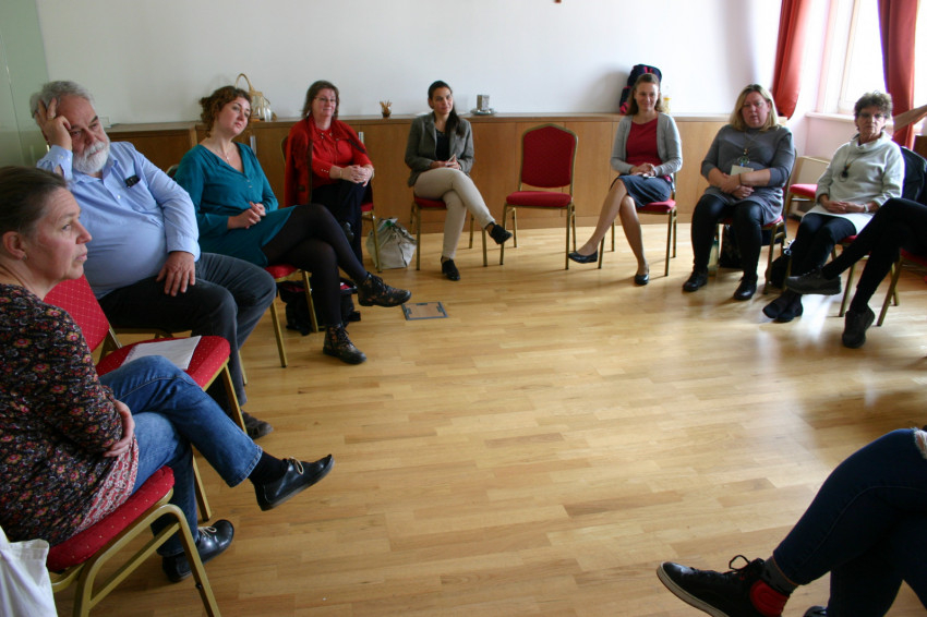 A délelőtt folyamán a résztvevők megismerkedtek a reflektív team szupervíziós módszerrel. Sólyom Bea – aki a Ferences Kilátó vezetője – volt ebben segítségünkre. Beával azt beszéltük meg, hogy nem előadást tart, hanem műhelymunka formájában azonnal kipróbáljuk, és a gyakorlatban ismerjük meg a módszert. Már a csoporton belüli ismerkedés is játékos formában történt, ezzel is gazdagítva a résztvevők ötlettárát, hiszen ezeket az intézményi munkájuk során tudják hasznosítani.