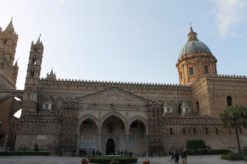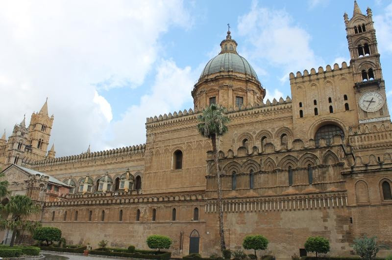 Szicíliában az évezredek során sokféle kultúra találkozott egymással. A palermói Nagyboldogasszony-főszékesegyházban őrzik a város védőszentjének, Szent Rozáliának ereklyéit. Az első templomot a 4. században kezdték el építeni, a 313-as milánói ediktumot követően, amely a Római Birodalom területén engedélyezte a keresztény hit gyakorlását. A bazilika a 9. századtól, miután a szaracénok elfoglalták a várost, mecsetként működött egészen 1072-ig, amikor Palermo a normannok uralma alá került. Ezt követően építkezés kezdődött, és 1185-ben fejezték be az az angol származású Walter Off the Mill érsek kezdeményezésére épített új katedrálist. A normann mellett a templom egyes részeiben ma is felfedezhetőek az arab hatás építészeti emlékei. A 18. századi barokk átalakítás már a spanyol uralom alatt következett be. A templom kincstárában őrzik II. Frigyes német-római császár (1212–1250) első feleségének, Aragóniai Konstanciának koronáját. Konstancia korábban a fiatalon elhunyt Imre magyar király (1194–1204) felesége volt. A főszékesegyház egyben Frigyes császár és felesége nyughelye is.