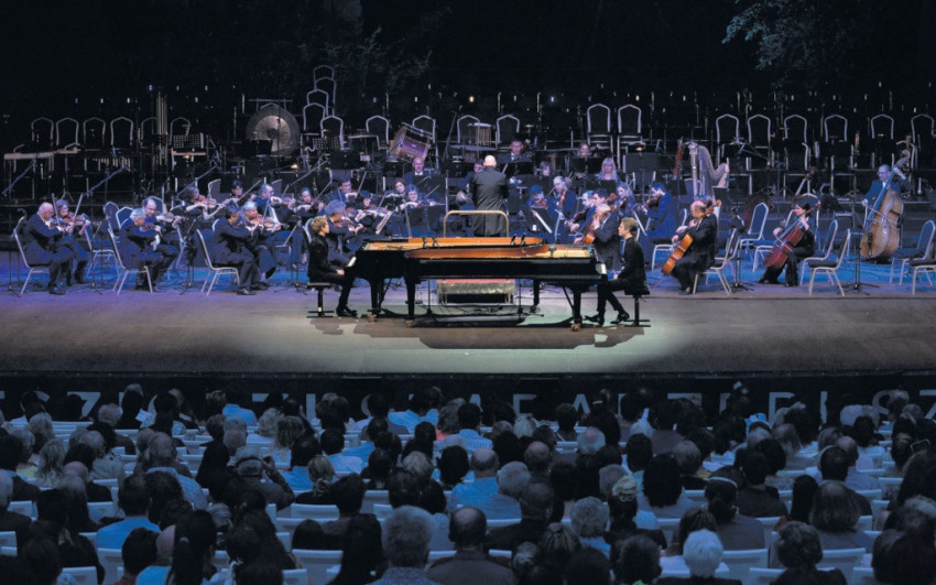 Nem hiszem, hogy megfontolt szerepjátszók lennének; úgy tűnik, a testvéri köteléken és az általuk művelt zene szeretetén túl a lelki rokonság is hozzájárul Lucas és Arthur rokonszenves művészi szimbiózisához. Persze óhatatlanul van valami kimódolt az ilyen közös pódiumi szereplésben. Ahogy öltözködésük „ikres” összehangolása, úgy eltérő egyéniségük ugyancsak külső jegyekkel történő tükröztetése is a kialakított imázs része lett. A divatosan belőtt séró Lucas esetében afféle eltökélt sportemberre, irányító focistára, Arthurnál lobogó, lánglelkű művészre „hajaz”. Szinte lámpaláz nélkül, vagy azt jól leplezve, természetes mosollyal lépnek színpadra, kedélyes gesztusokkal kommunikálva egymással és a karmesterrel. A zenekari bevezető alatt a zongora mellől még egy gyors terepszemle, felmérő körbepillantás a szélesen elterülő nézőtérre, aztán marad a zene: a már ki tudja, hányszor megszólaltatott Mozart-opus. A fivérek láthatóan élvezik ezt a huszonöt perces, könnyed művet, a közös játékot, de komolyan veszik. Nem rutinból zenélnek, az egymásra koncentráló, jelző biccentések, a nehezebb belépéseknél a dirigens intéseinek figyelmes, bizalomról árulkodó követése tökéletes összpontosításra utal. Nem gondolnánk, hogy efféle „kamarazenélés” működhet a szabadtéren, de a hozzáállás és a hangzás minősége eloszlatja a kétségeket. Meglepetés, hogy e fesztiválközönség avatott koncertlátogatókból áll, senki sem tapsol bele a versenyműbe. Az Andante sajátos próba elé állítja a szólistákat, mert a távolból, talán a pesti oldalon horgonyzó hajóról vagy egy Duna-parti szórakozóhelyről áthallik a „duc-duc”. A legrosszabbkor előtolakodó zajhulladék minden tekintetben e lassúbb, bensőséges tétel ellentéte. A Jussen testvérek azonban profik, nem jönnek zavarba, nem zökkenti ki őket a beszüremlő idegenség. Látszólag tudomást sem vesznek a pódiumon túli külvilágról, az újraéledt Budapest más régióiból érkező hangokról, az itt kialakuló stílus- és ritmuskavalkádról. A Rondó felszabadult örömzenélése után a „jelenbe” visszatérve, ismét két trendi ifjú művész hajlong a színpadon külön-külön és bajtársiasan összekapaszkodva. Lelkesen, lezserül, olykor cinkossággal egymásra mutogatva, ahogyan a lemezborítókhoz, interjúkhoz és reklámanyagokhoz rendre „beállítják” őket. De ez a kép nem hamis, emberi és zenei őszinteségükben az elhangzottak után nincs okunk kételkedni.