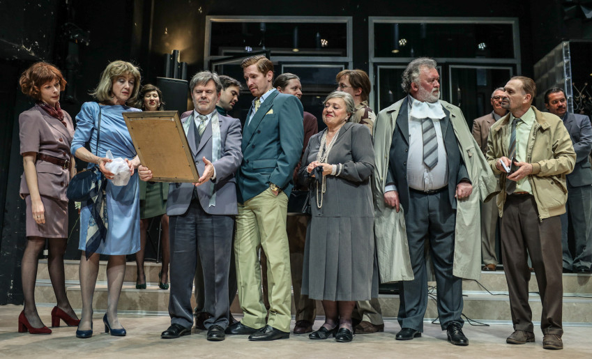 Csak felesége (Für Anikó) áll a leköszönő igazgató mellett. Ranot munkatársa (Vajda Mihály) és annak házastársa (Szandtner Anna) bizonyos mértékig kívül maradnak az eseményeken, a szálakat a náluk befolyásosabbak mozgathatják, mint a helyi közigazgatás képviselői (Takács Nóra Diána és Ficza István). A hiteles színészi alakítás igazi kihívás ebben a darabban: a kortárs dráma szövege nem egyszerű, ugyanakkor a csinovnyikirodalomból ismerős karakterek színrevitele nagyfokú mértéktartást is igényel. A munkatársakat és a hivatalnokokat, valamint azok hozzátartozóit alakító művészek (Dóra Béla, Józsa Bettina, Tenki Réka, Friedenthal Zoltán, Baksa Imre, Novkov Máté) azonban sikerrel oldják meg ezt a feladatot. A tizenhét szereplő a darab nagyobb részében egyidejűleg áll a színpadon, kisebb-nagyobb csoportokban beszélgetnek, láthatóan mindennapi dolgokról, általában minden lelkesedés nélkül.