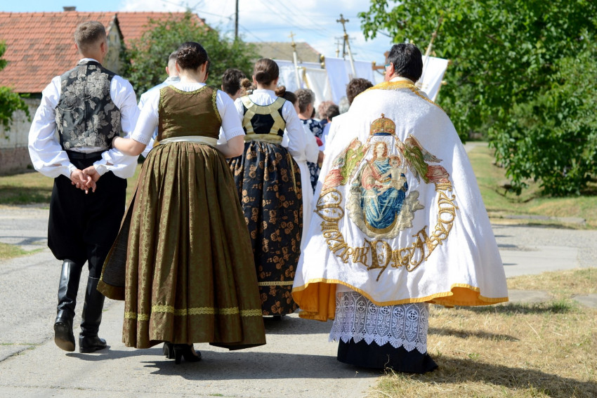 Őt követik a népviseletbe öltözött hívek és a tamburások, aztán a liturgikus ruhákat viselő asszisztencia, leghátul pedig a feldíszített hintón ül a manuduktor, a falu plébánosa. Mögötte sorakoznak a lobogósok és végül a hívek. Így halad végig a menet Katymáron, ezen a három nemzetiségű falun, ahol a házak egykorvolt jólétről, gazdagságról mesélnek.