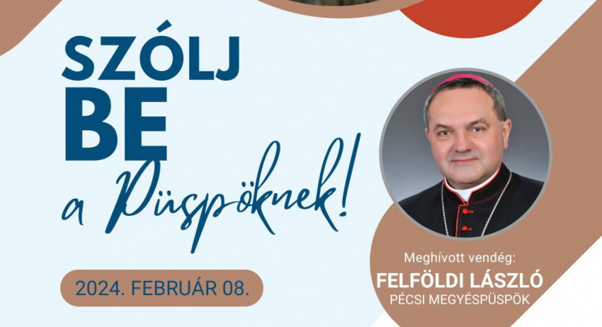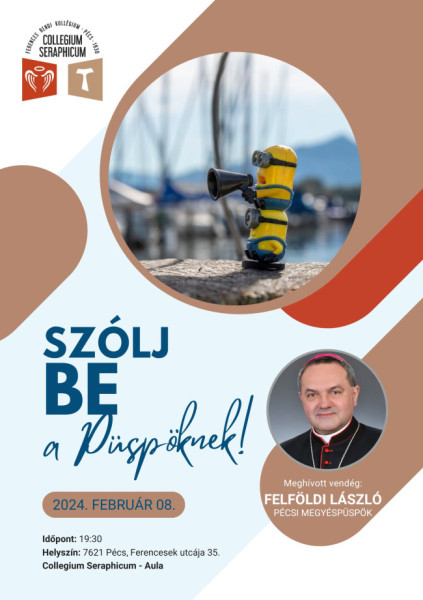 A nem mindennapi, példaértékű sorozat következő alkalmára ezúttal pécsi helyszínen és a vitapartner egyházi szolgálatának státuszához igazítva Szólj be a püspöknek! címmel kerül sor február 8-án, 19.30-kor a Pécs belvárosában található egyetemi és főiskolai Collegium Seraphicum aulájában, ahol Felföldi László, a Pécsi Egyházmegye püspöke várja a fiatalokat.