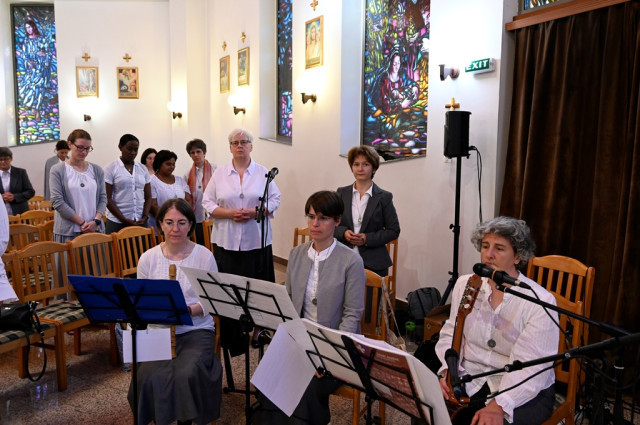 A hálaadó püspöki szentmise este 6 órakor kezdődött, amelyen a megyéspüspökkel számos atya koncelebrált, azok is, akiknek plébániáján a testvérek élnek, dolgoznak. Székely János megyéspüspök beszédében kiemelte, milyen sokrétű szolgálatot végeznek a testvérek egyházmegyénkben. Margit testvérnek egy álmát idézte („bárcsak a Szentlélek tüzétől lángokban állnának a kápolnáink”), mintha ezen a délutánon itt is „lángokban állt volna a templom a Szentlélek tüzétől”. A szentmisén a társaság testvérei taizéi énekekkel szolgáltak. A mise végén a „Szent Szűz tiszteletére” szóló akatisztoszt énekeltük, hiszen a mai nap a rózsafüzér hónapjának kezdete, egyúttal az „Istenszülő oltalma” görögkatolikus testvéreink liturgiájában.