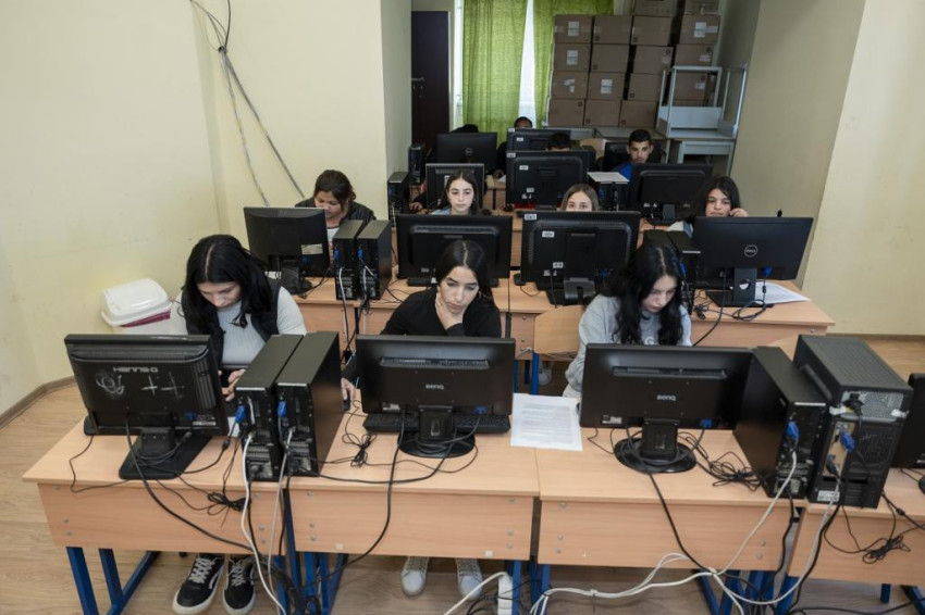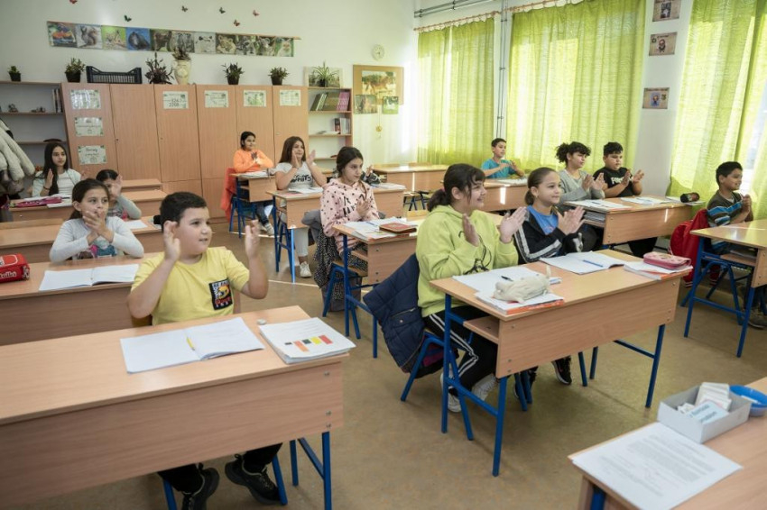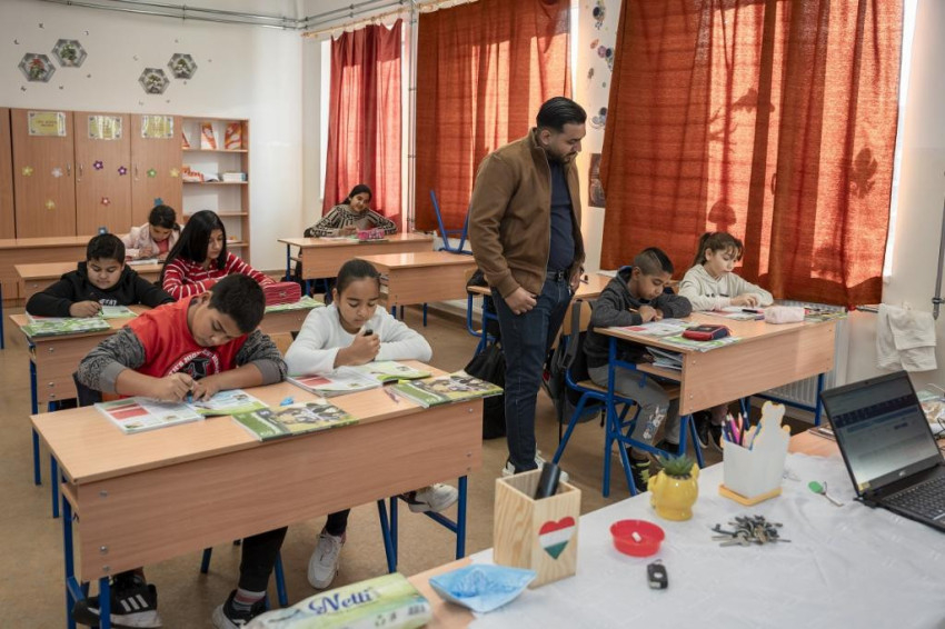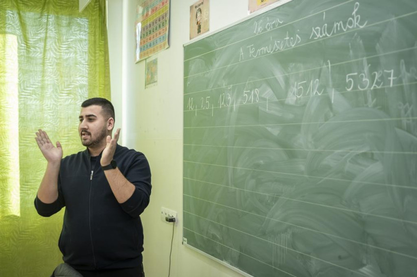 A folyosó másik végén az 5.B a természetes számokról tanul. Az osztályfőnök, Demeter Roland mozgásos feladattal dobja fel a fáradó gyerekeket: ha a táblára írt számokban szerepel az 1-es számjegy, tapsolni kell, a 2-esnél az asztalra csapni, az 5-ösnél csettinteni. A feladat csak látszólag egyszerű, muszáj koncentrálni, hogy jól sikerüljön, de nagy dicséret jár érte. Demeter Roland most épp tanít, de más napokon maga is diák, Mányi Zsolttal együtt ő is a szarvasi tanítóképzőbe jár.