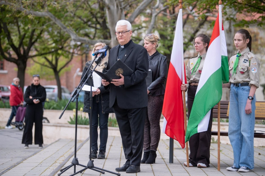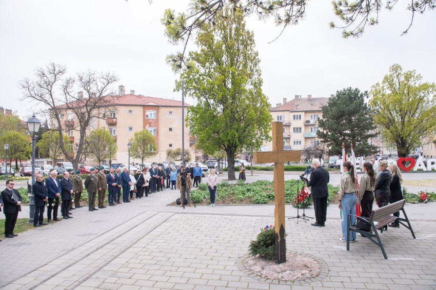 A magyar és a lengyel himnusz elhangzása után Szalai Tamás, a nemzetiségi önkormányzat elnöke mondott beszédet. „A rendszerváltás óta eltelt nagyjából 35 év alatt a bukott kommunista rendszer egyik, ha nem a legnagyobb a »szekrényből kieső csontváza« Katyń. Ma már nyíltan, félelem nélkül tudunk beszélni a világ ezen részén az 1940-ben történt, emberi aggyal fel nem fogható tisztogatásról, tömeggyilkosság-sorozatról” – fogalmazott, majd felelevenítette a háborús bűncselekmény történetét. Hozzátette, az országban több helyen kopjafák, emléktáblák, tölgyfaleveleket, monumentális erdőket megformáló alkotások őrzik Katyń és Szmolenszk emlékét, de csak néhány helyen áll kereszt. Szalai Tamás köszönetét fejezte ki Székesfehérvár városvezetésének az emlékkereszt felállításáért és közvetlen környezetének gondozásáért.