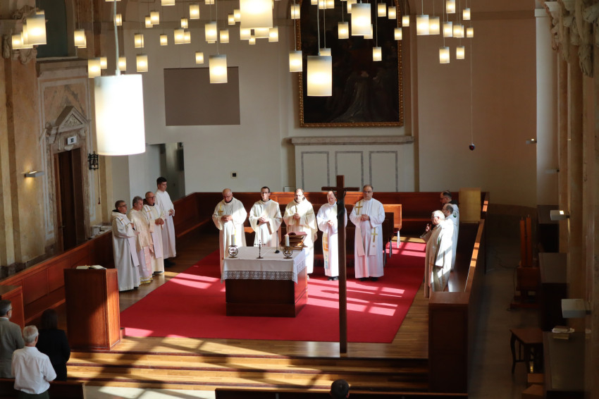 A Kalazanci Szent József piarista kápolnában a főcelebráns Berhidai Piusz OFM provinciálissal koncelebrált többek között Hortobágyi Cirill OSB pannonhalmi főapát; Zsódi Viktor SchP piarista tartományfőnök; a leköszönő rektor, Fehérváry Örs Jákó OSB és a Sapientia új rektora, Bagyinszki Péter Ágoston OFM.