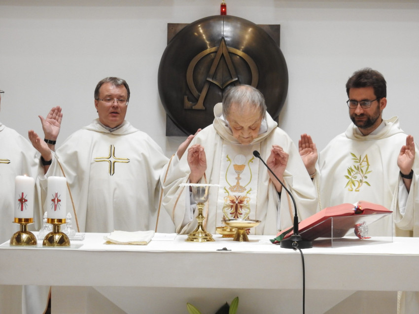 A szentmise homíliáját maga az ünnepelt mondta, aki felidézte, hogy hatvan éve – domonkos szokás szerint – a „Confitemini Domino quoniam bonus” szavakkal kezdte első szentmiséjét. Ezt a latin kifejezést szokták mondani a szentgyónás, feloldozás után is. „Adjatok hálát az Úrnak, mert jóságos hozzánk” – a magyar megfelelő jó fordítás, de a kifejezés még többféle értelmezést tesz lehetővé. Benne van az, hogy adjunk hálát Istennek, mondjunk köszönetet, valljuk meg, dicsőítsük Őt. A válasz erre a segédkezők részéről: „Confiteor Deo omnipotenti.” („Megvallom a mindenható Isten előtt.”) Igen, Istent megvallani akarjuk, mindenképpen dicsőíteni, hálát adni neki. Miért? „Quoniam bonus”, mert Ő jó. Isten maga a jóság, tökéletes, igaz, szépség, szentség, minden, ami jó, az megvan Őbenne, mert Ő jó önmagától fogva mindörökre. Minket, embereket nyilván az érdekel elsősorban, hogy Ő hozzánk is jó. Miben nyilvánul meg ez? „Quoniam in saeculum misericordia eius.” Mert irgalma örökké megmarad. Megbocsát nekünk gyarlóságaink ellenére is. Minden ajándékkal, kegyelemmel elhalmoz bennünket.