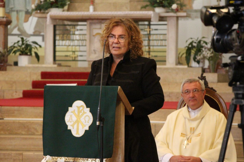 Blaskó József gimnáziumi tanár a közösség nevében köszönte meg Istennek, hogy az elmúlt száz évben fenntartotta a komáromi egyházközséget. Felidézte: két évvel a trianoni országcsonkítás után, 1922-ben Surányi Ferenc atya szervezte meg a plébániát. Előtte ugyanis vallásilag is a történelmi Komárom része volt a Dunától délre eső rész. A hívek létszáma annyira megnőtt, hogy új templom építését kezdeményezte. A Jézus Szíve-templom – vagy ahogy a városban ismert: nagytemplom – 1937-ben készült el. Az ifjúság vallási nevelésére az Isteni Megváltó Nővérek vezetésével iskolát alapítottak. A virágzó hitéletet megakasztotta a II. világháború. Alapy Gáspár, a város polgármestere és a helyi egyházközség világi elnöke felemelte szavát a zsidótörvények és a zsidók deportálása ellen, ezért a dachaui koncentrációs táborba hurcolták, ahol mártírhalált halt. A kommunista diktatúra elnyomása után a rendszerváltást követően újraindulhatott a katolikus iskola.