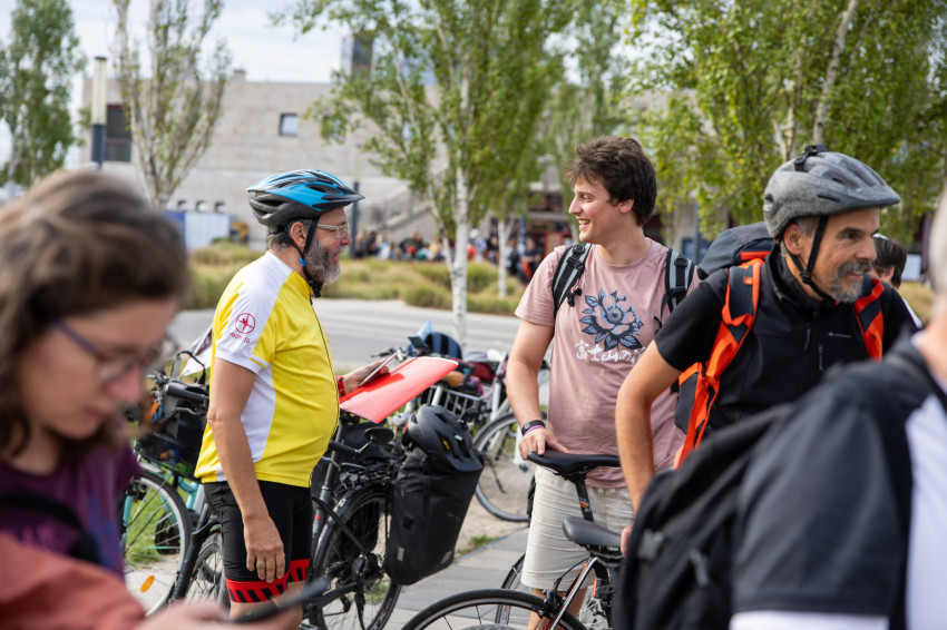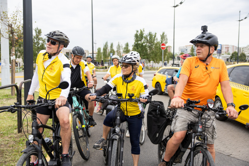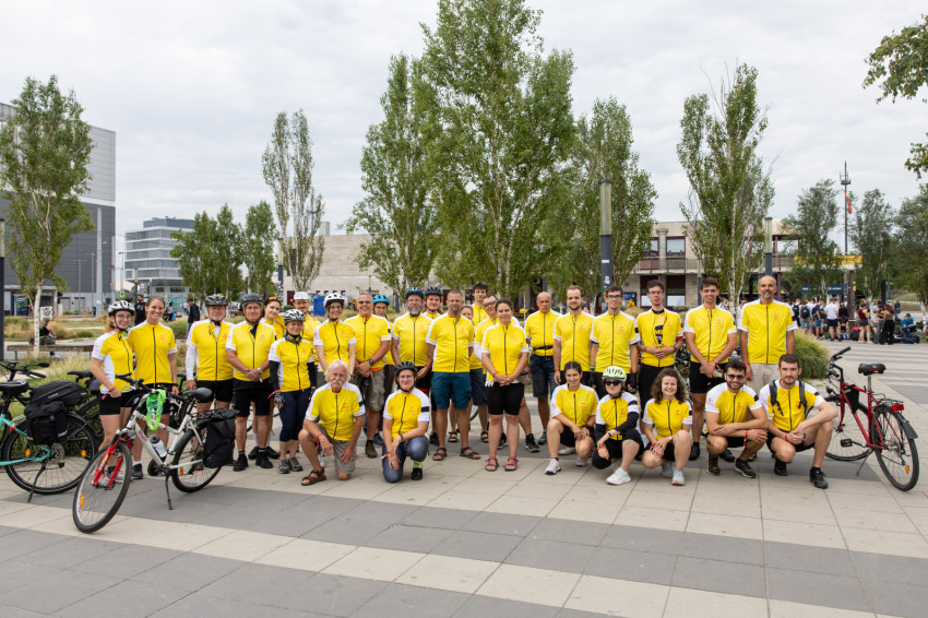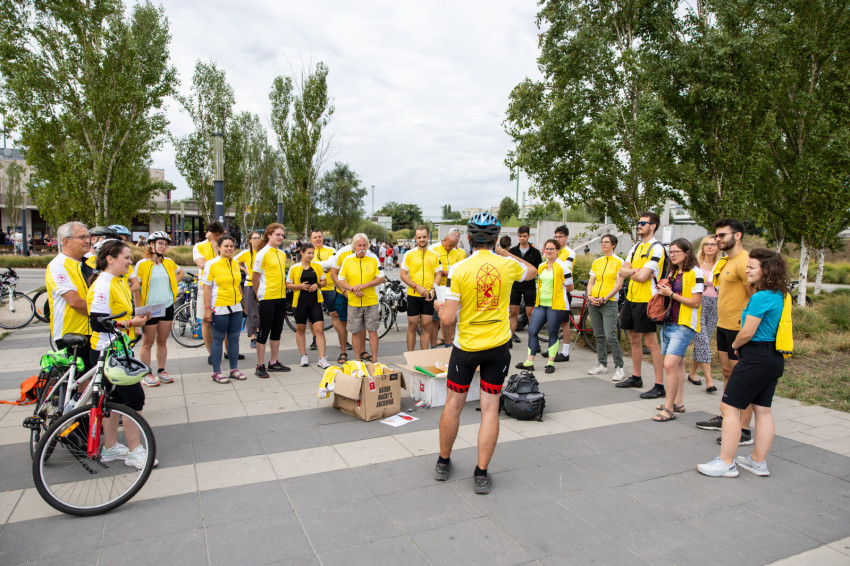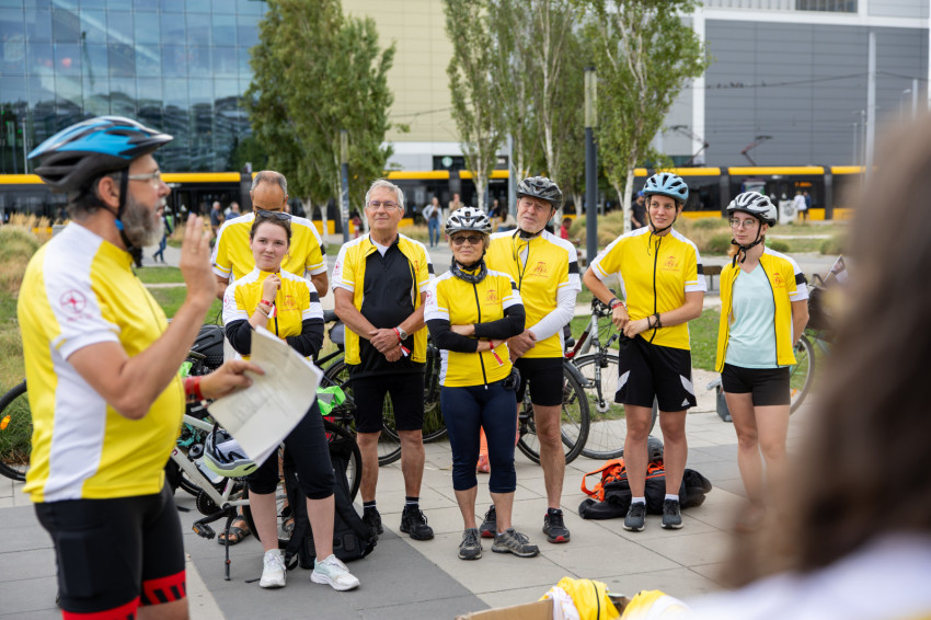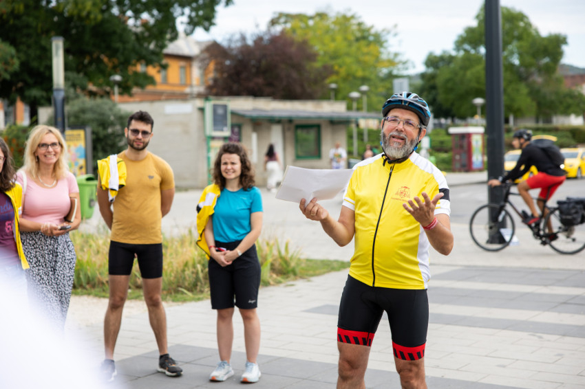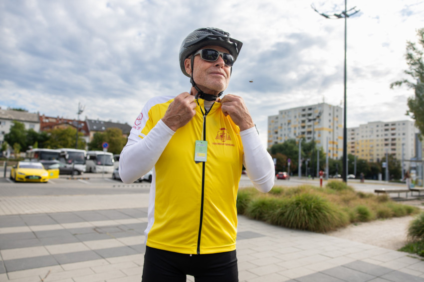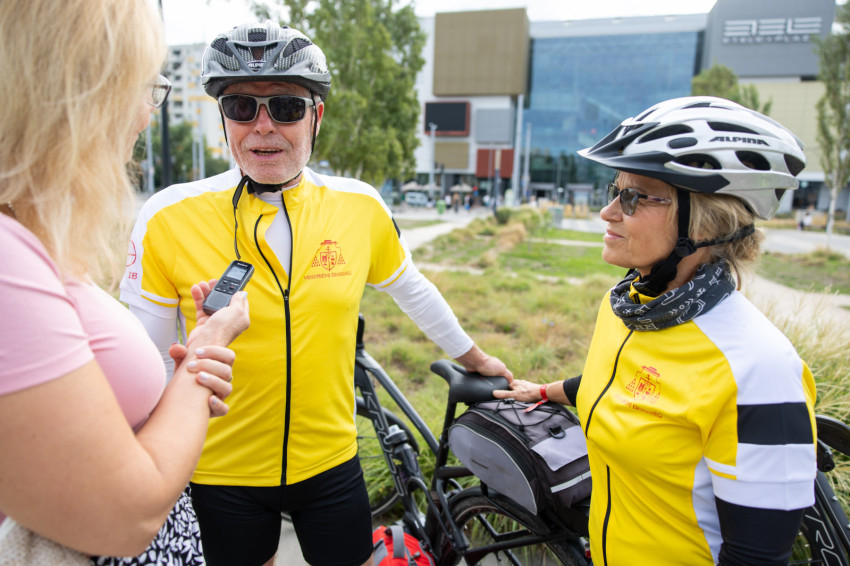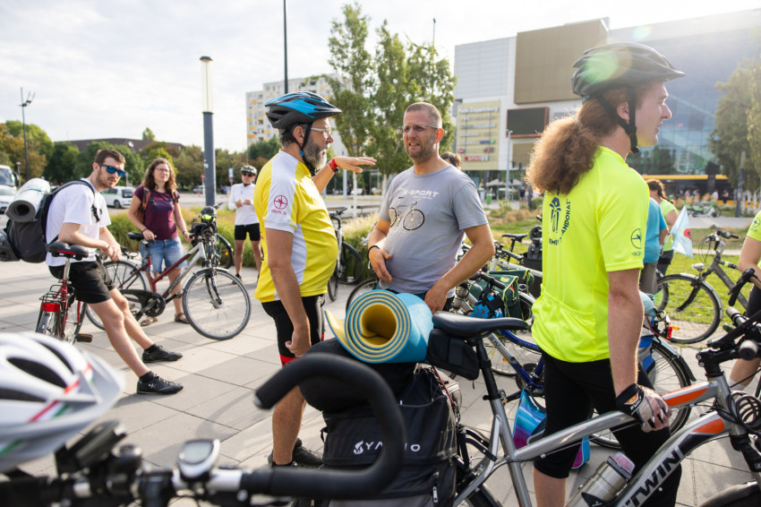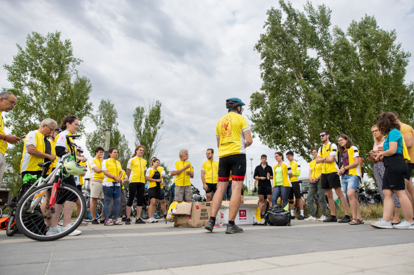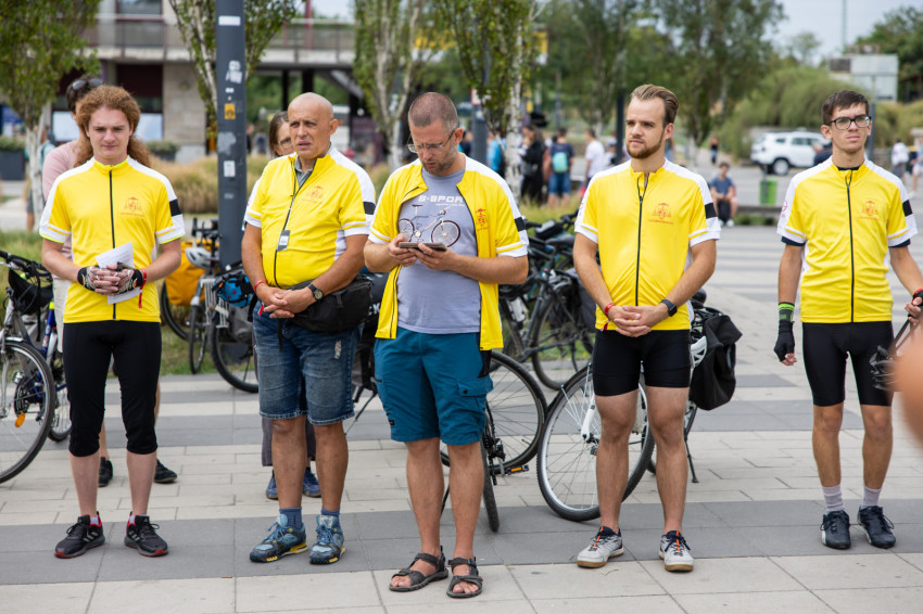 Az indulás előtt kiosztották a logós csokikat, Csoboka pedig lelkileg táplálta a csapatot. Ivancsó Bazil atya imádsága és áldása után közös fotó készült a biciklis zarándokokról, akik együtt indultak a Tétényi úton át Biatorbágy felé.