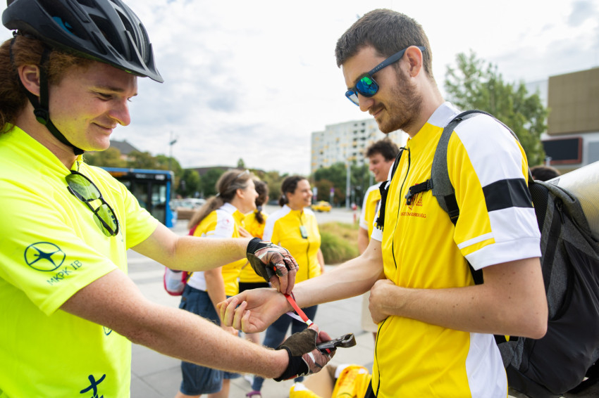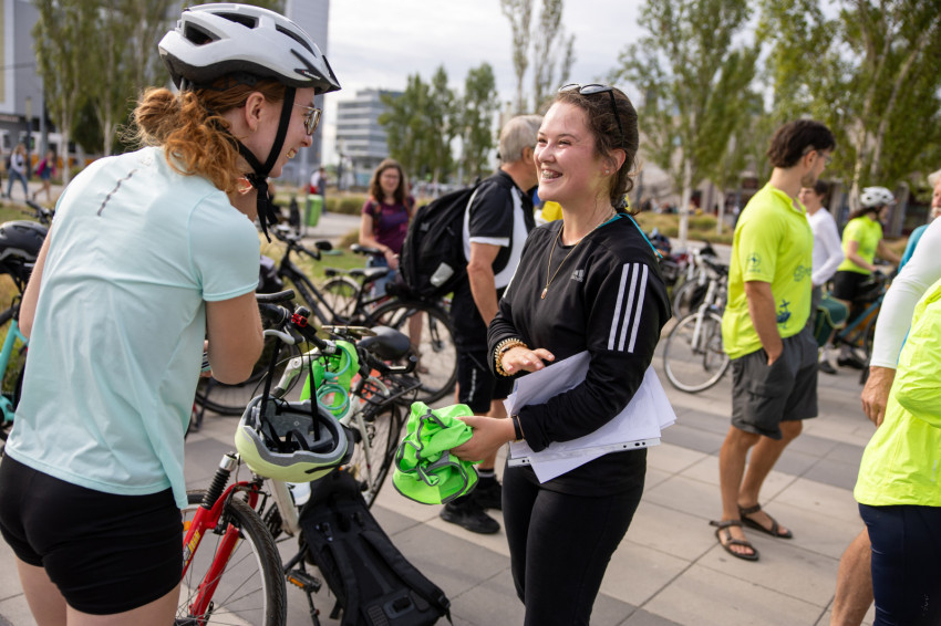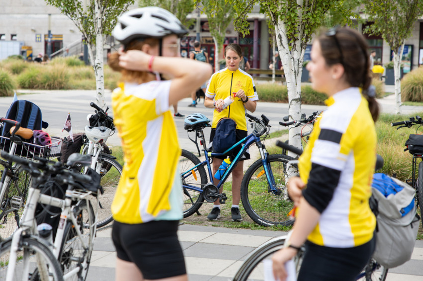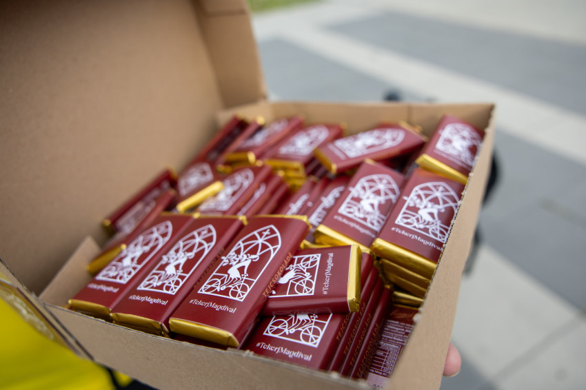 Csütörtök reggel nagyjából harmincöten gyűltek össze Kelenföldön a vasútállomásnál, hozzájuk Székesfehérváron még kilencen-tízen fognak csatlakozni. Mindenki nagyon mutatós sportpólót visel, amit a Veszprémi Érsekségtől kaptak a Magyar Katolikus Püspöki Konferencia Ifjúsági Bizottsága támogatásával, rajta a boldoggá avatás hivatalos logójával és #TekerjMagdival felirattal. A gyülekezésnél felteszik a logós karszalagot, és kapnak egy matricát is, melyet a biciklire lehet ragasztani. Meglepetés is fogadja őket: a #TekerjMagdival feliratú csokoládé.