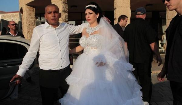 A Gázai övezetben dúló harcok által amúgy is feltüzelt, rasszista feliratokkal ellátott pólókban tüntető aktivisták egész este macska-egér harcot játszottak a helyszínre kivezényelt rendőrökkel: igyekeztek a meghívottak közelébe férkőzni, inzultálni próbálták őket, illetve szitokáradatot zúdítottak a fiatal pár házasságát támogatókra. Az ifjú pár szimpatizánsai rózsákkal és a „szerelem mindennél erősebb” voltát, valamint a zsidók és muzulmánok békés együttélését hirdető transzparensekkel jelentek meg.