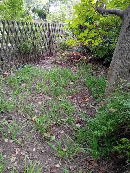 A téglavörös virágú, igénytelen, sarjakkal is terjedő régi fajtát már évek óta hagyjuk a diófa alatt terjedni. Lassan már nincs is más növény itt, hiszen mély az árnyék, és a lehullott diófalombot is kevés növény viseli el téli takaróként. De a sásliliom virul, öntözés nélkül is, nyáron néhány hétig még a virágaival is kedveskedik, aztán augusztusra elfekszik, szalmasárgára fakul a lombja, végül le lehet gereblyézni, csak a csupasz, mélyen repedezett talaj marad, de ez éppen jó, hiszen Kisasszony napján elkezd potyogni a dió, könnyű így megtalálni őket. Mire vége a diószüretnek, újra kihajt, és zöldell egész ősszel.