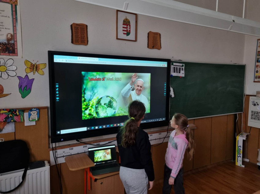 Az óvodásokkal is megemlékeztek az Istentől kapott világ szépségéről. A teremtésről beszélgettek. A csoportok plakátokat készítettek a Föld napja kapcsán, amelyekkel aztán az óvoda folyosóját díszítették. Az óvoda udvarán az alsó tagozatosokkal együtt énekelték el a Ki teremtette... kezdetű dalt.