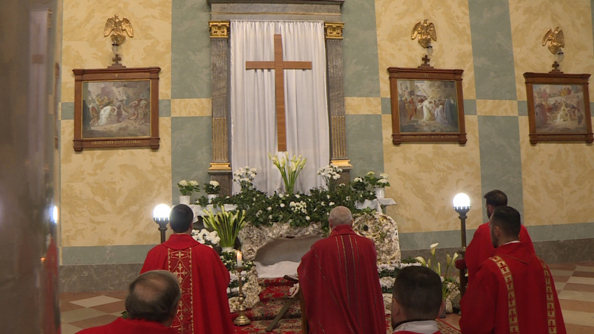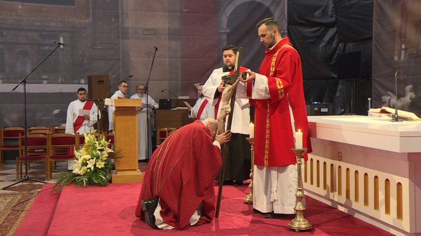 Az egyetemes könyörgéseket követően a papnövendékek ünnepélyesen a miséző oltár elé vitték Krisztus keresztjét, amely előtt a főpásztor és a jelenlévő hívők kifejezték hódolatukat.