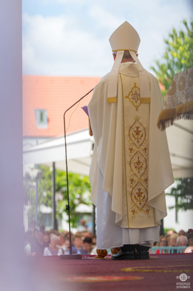 „Örömmel fogadtam el Szocska Ábel nyíregyházi megyéspüspök úr meghívását és felkérését, hogy részt vegyek a Nyíregyházi Egyházmegye alapításának 10. évfordulója alkalmából ezen az egyházmegyei zarándoklaton itt a máriapócsi szentélyben. Ez a nemzeti kegyhely, ahol a Könnyező Szűzanyát tiszteljük, lelki központja a három egyházmegyének, az egész görögkatolikus közösségnek – kezdte szentbeszédét az érsek. – A kegyképet azonban nemcsak ebben a szentélyben, hanem két latin szertartású székesegyházban is tisztelik és nagy becsben tartják. Az egyik a bécsi Szent István-dóm, ahol az eredeti kegykép található, a másik az egri bazilika, ahol a kegyképnek egy ősi másolata közelében őrizzük azt a keretbe foglalt kendőcskét is, amellyel az első könnyezéskor a Szűzanya könnyeit letörölték.