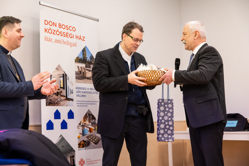 A mise után az ünneplés a Don Bosco-oratóriumban folytatódott, ahol a szeretetvendégség előtt a jelenlévők vetített képes összeállítást tekinthettek meg Andrásfalvy János volt tartományfőnök tevékenységének legfontosabb eseményeiből, valamint a rendtársak és a világi munkatársak átadták ajándékaikat a volt elöljárónak.