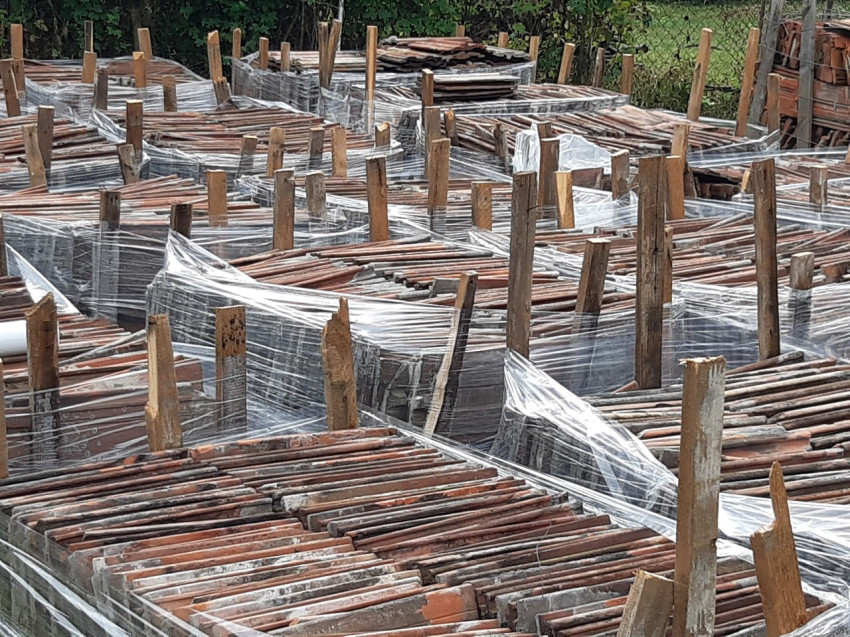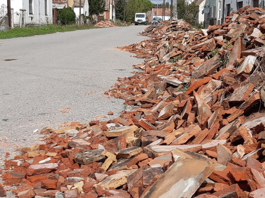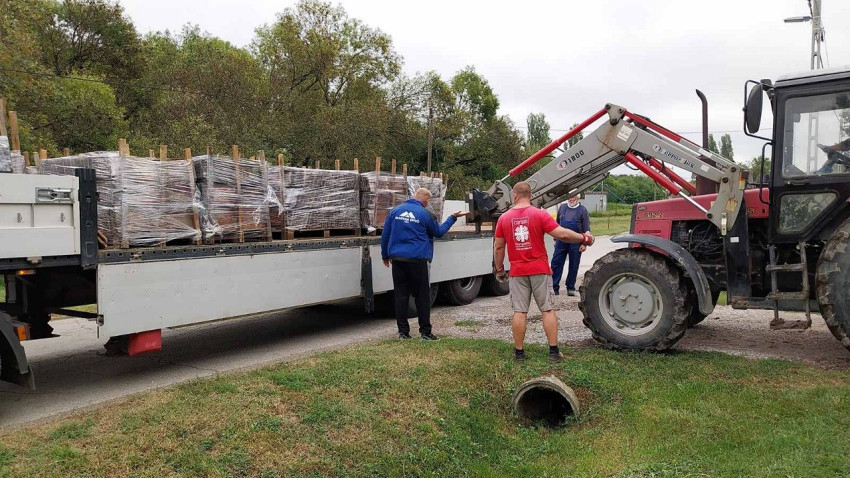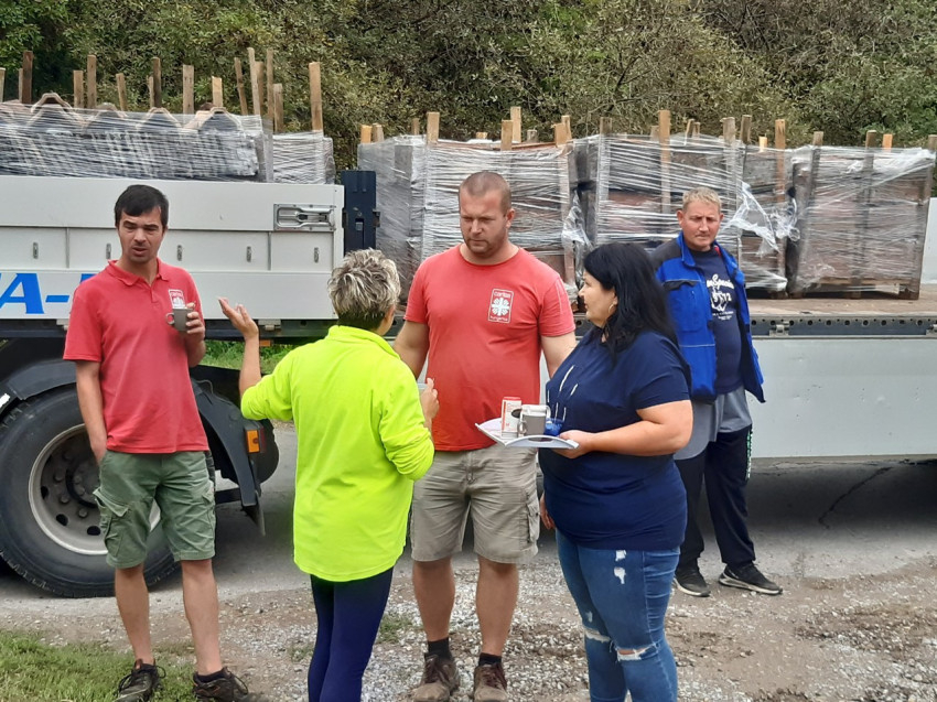 A rakodás gyorsan ment, még egy rögtönzött fuvarlevélírás, és indulhattunk. Az első cserépszállítmány Kákicsra, a Marócsával szomszédos településére indult. A reggeli hűvös időt lassan felváltotta a kellemes meleg, mire odaértünk a közel kétszáz fős településre. A falu egyetlen zárható udvarán a szociális téli tüzelők mellett már előkészítették a terepet a cserepek fogadására. Szekeresné Spang Lívia polgármester asszony és kísérői mellett a Pécsi Egyházmegyei Karitász dolgozói, Fónai Péter és Király Dávid vártak ránk. Péter és Dávid azok, akik a kezdetektől fogva a jégkármentést koordinálják és a munka nehezét végzik. Miközben kamionunk megszabadult a huszonnégy raklapnyi cseréptől, Péter és Dávid körbevezetett minket a környéken. Még további négy ház tetejére kell cserép.