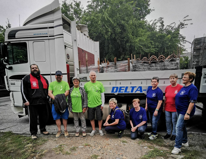 Szeptember 25-én, hétfő reggel fél nyolcra mentünk a szekszárdi „Kerihez” (Tolna Vármegyei SZC Bezerédj István Technikum). Már bent állt az udvaron a hatalmas kamion, amikor odaértem. Egy rakodógép csinos cserépcsomagokat pakolt a pótkocsira, miközben összegyűlt a mi kis csapatunk. Rakodás közben az elengedhetetlen csoportkép is elkészült, számos ember munkája kell egy ilyen akcióhoz. Jelen volt főszervezőnk, Vég Beáta és segítői, Kis Jánosné, Kishonti Ádámné és Agócs Ferencné a kórházlelkészségtől, továbbá Kovács Jánosné, a szekszárdi karitász vezetője, valamint a Csatár Civil Egyesület tagjai: Bartók Julianna, Szegedi Attila, Máté János és Nagy Ferenc. Nagy Ferencnek külön köszönet az áldozatos munkáért a tetőcserép megszerzésében és a fuvar megszervezésben. A „Tetőnyi szeretet” felhívás sok embert mozgatott meg. Istennek hála erre a napra lett elegendő anyagi és fizikai segítség. Az ingyenes fuvart a Delta-E biztosította. Külön köszönet érte!