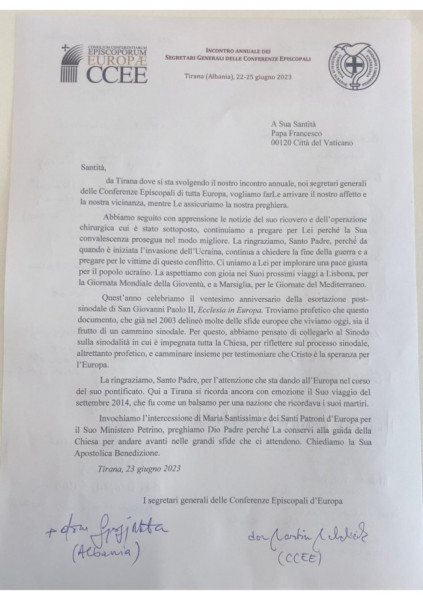A találkozó elején a CCEE elnöke, Gintaras Grušas érsek átadta a Szentatyának az összes európai püspöki konferencia titkára által aláírt levelet, amelyben szeretetüket és közelségüket kívánták kifejezni a Szentatyának, valamint imáikról biztosították a június 7-i műtét utáni mielőbbi felépüléséért: „Aggodalommal követtük a kórházi tartózkodásáról és a műtéti beavatkozásról szóló híreket, továbbra is imádkozunk Önért, hogy felépülése a lehető legjobban folytatódjon” – áll a levélben.