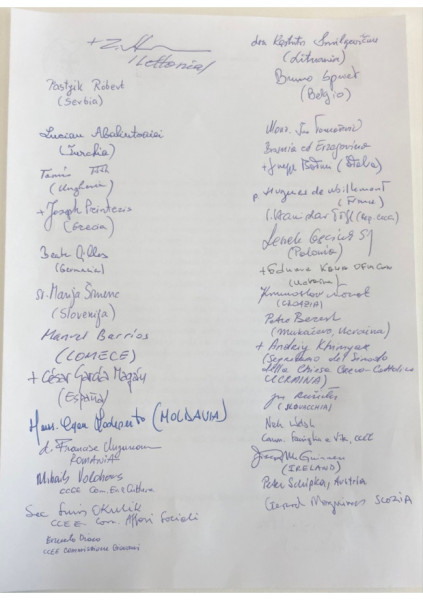 A titkárok aláírása, köztük az első Pastyik Róberté, a Szent Cirill és Metód Nemzetközi Püspöki Konferencia főtitkáráé, a harmadik Tóth Tamásé, az MKPK titkáráé