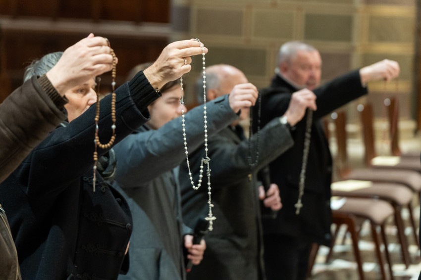 A bazilika szentélye elé felállított kereszt előtt mintegy húsz férfi imádkozta együtt a szentolvasót Fekete Zoltán, a székesegyház káplánja vezetésével.